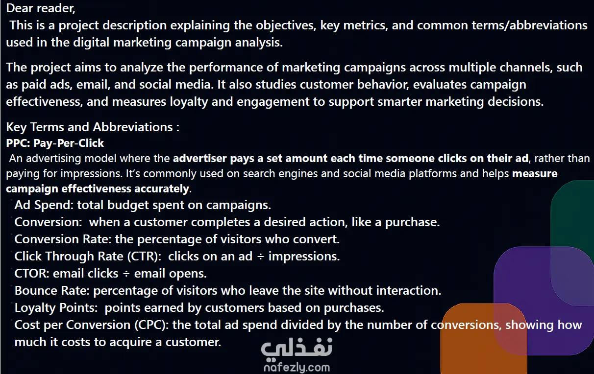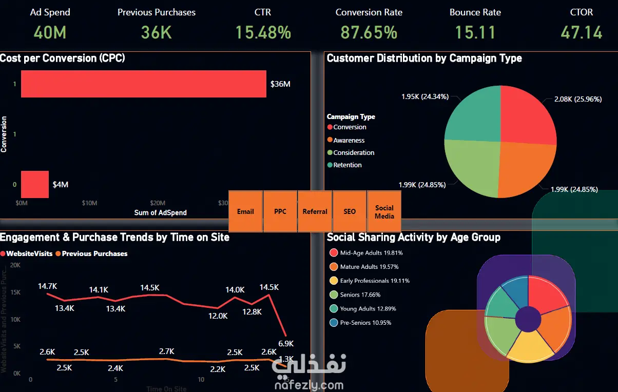 لوحة معلومات Power BI شاملة لتحليل حملات التسويق الرقمي. تتبع أداء الإعلانات وسلوك العملاء ونسبة النقر إلى الظهور ومعدلات التحويل والمقاييس الرئيسية الأخرى لدعم اتخاذ قرارات تسويقية أكثر ذكاءً وقائمة على البيانا