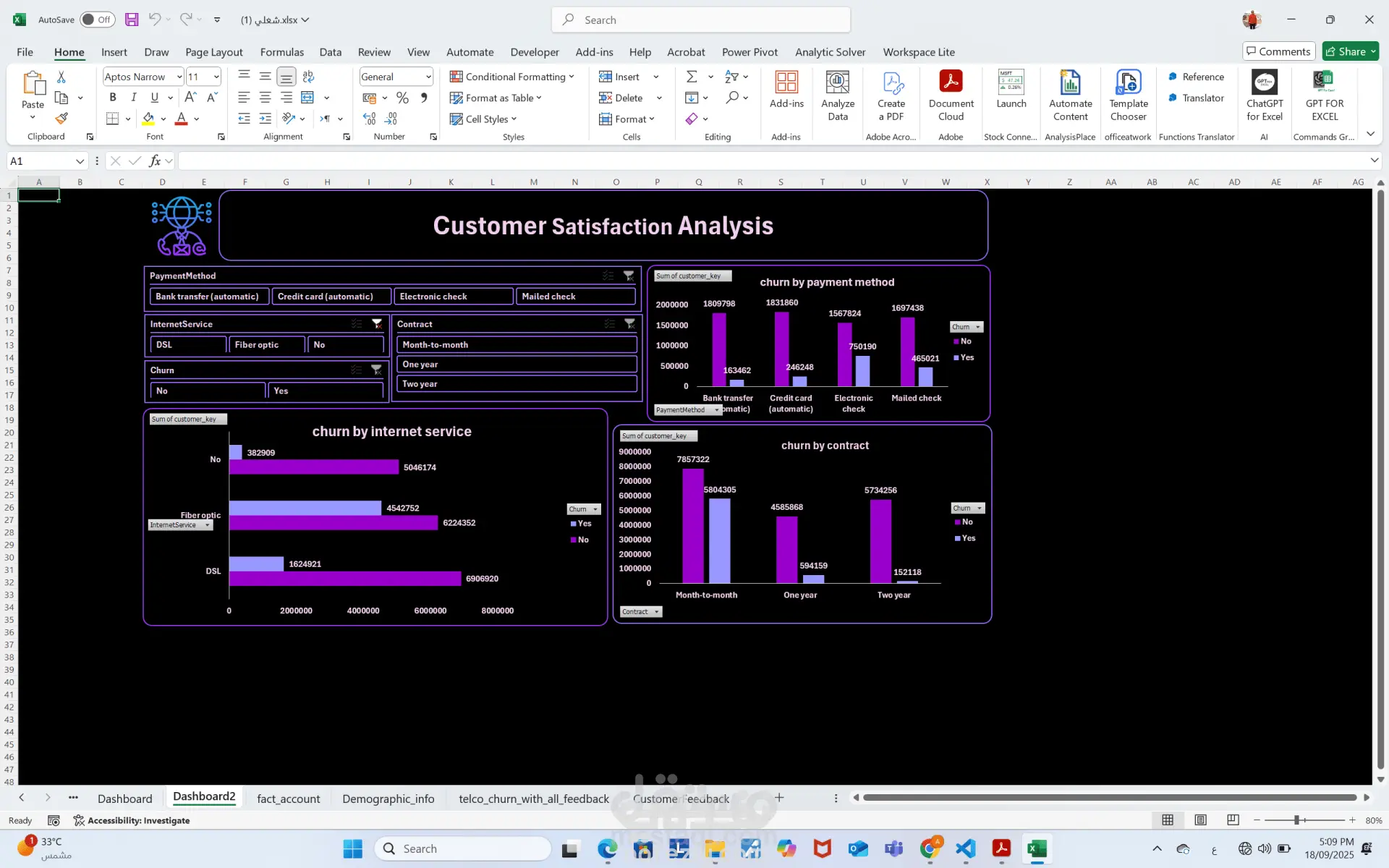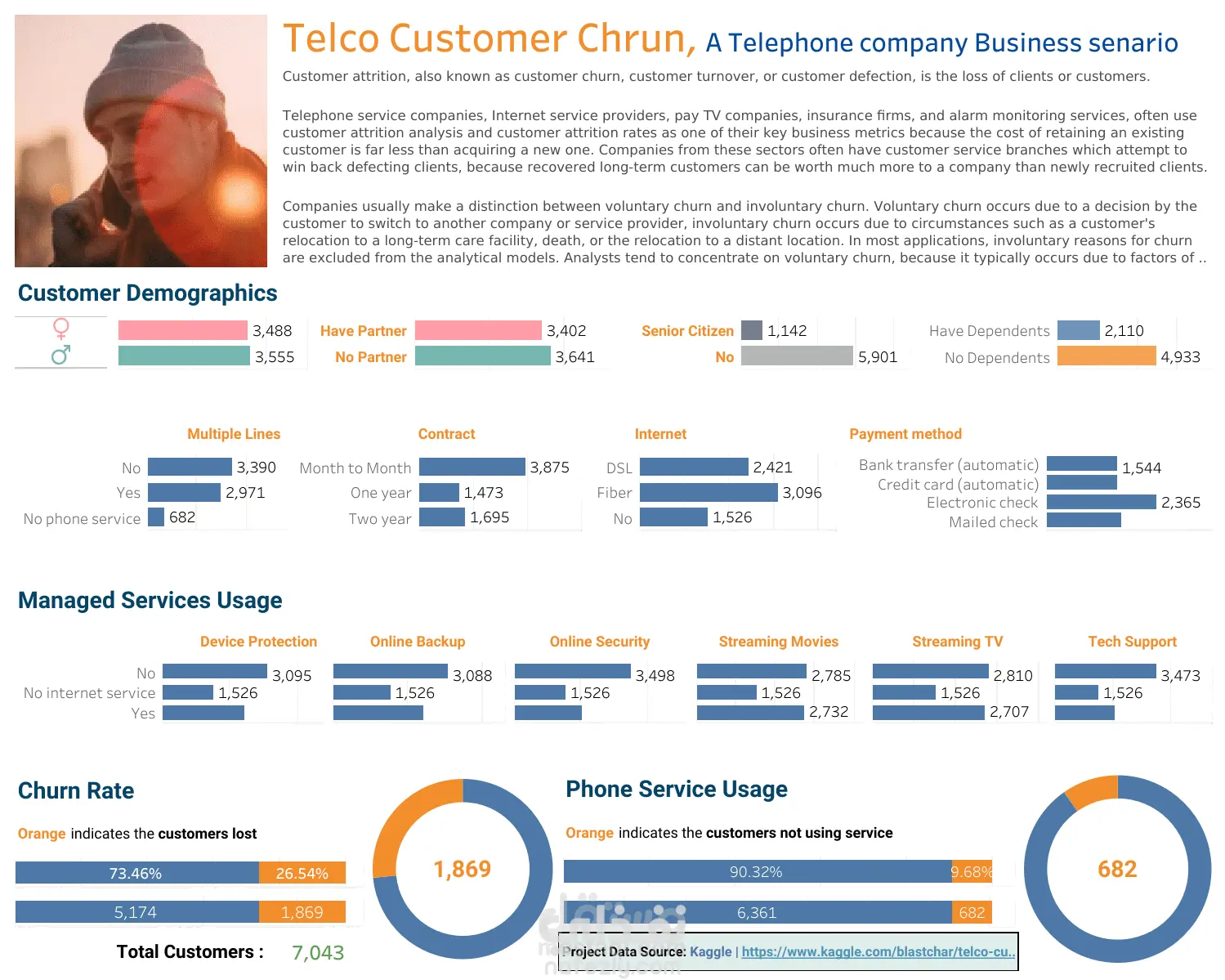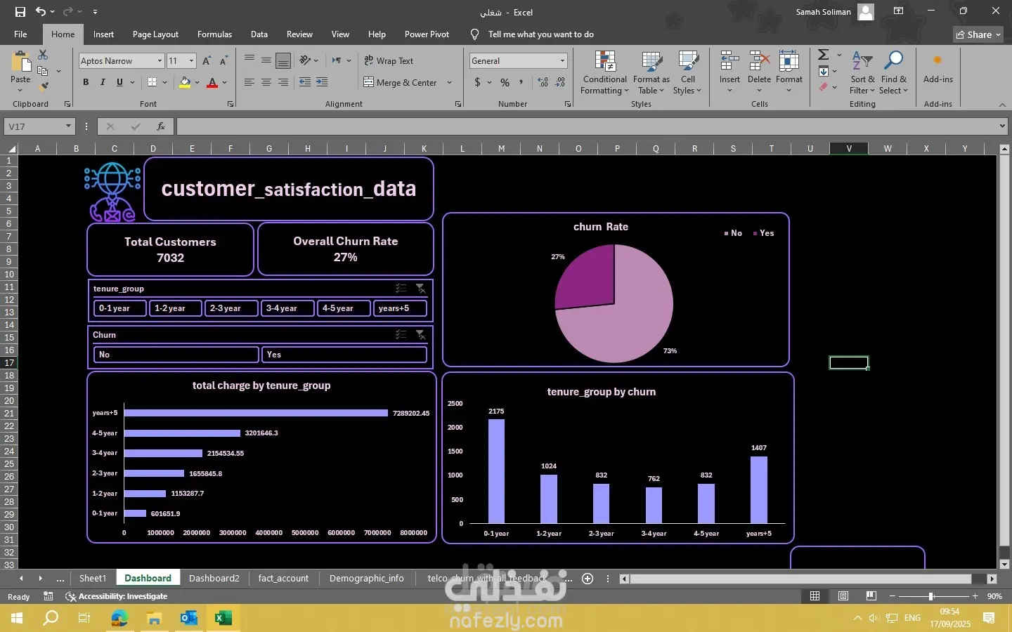 المشروع يركز على تحليل معدل فقد العملاء (Churn Analysis) في قطاع الاتصالات باستخدام لوحة بيانات (Dashboard). الفكرة الأساسية هي تتبع العملاء الذين يتركون الخدمة (Churn) مقابل العملاء الذين يستمرون، مع ربط ذلك ببيانات التغذية الراجعة (Feedback) الخاصة بهم.
