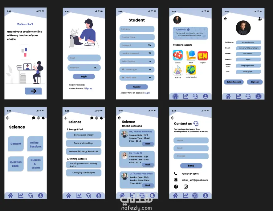 تطبيق Zaker Sa7 هو تطبيق تعليمي حديث يتيح للطلاب حضور جلساتهم التعليمية أونلاين مع أي معلم يختارونه بسهولة. يوفر التطبيق تجربة سلسة لتنظيم الجلسات ومتابعة الدروس عن بُعد بطريقة تفاعلية ومريحة. التصميم: تم تصميم واجهات التطبيق بالكامل على Figma بأسلوب عصري يركز على سهولة الاستخدام وتجربة المستخدم (UX/UI). الهدف من التطبيق: تسهيل الوصول إلى التعليم عن بُعد وتمكين الطلاب من اختيار المعلمين المناسبين لهم في أي وقت ومن أي مكان.