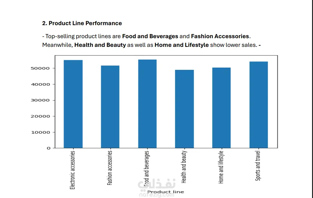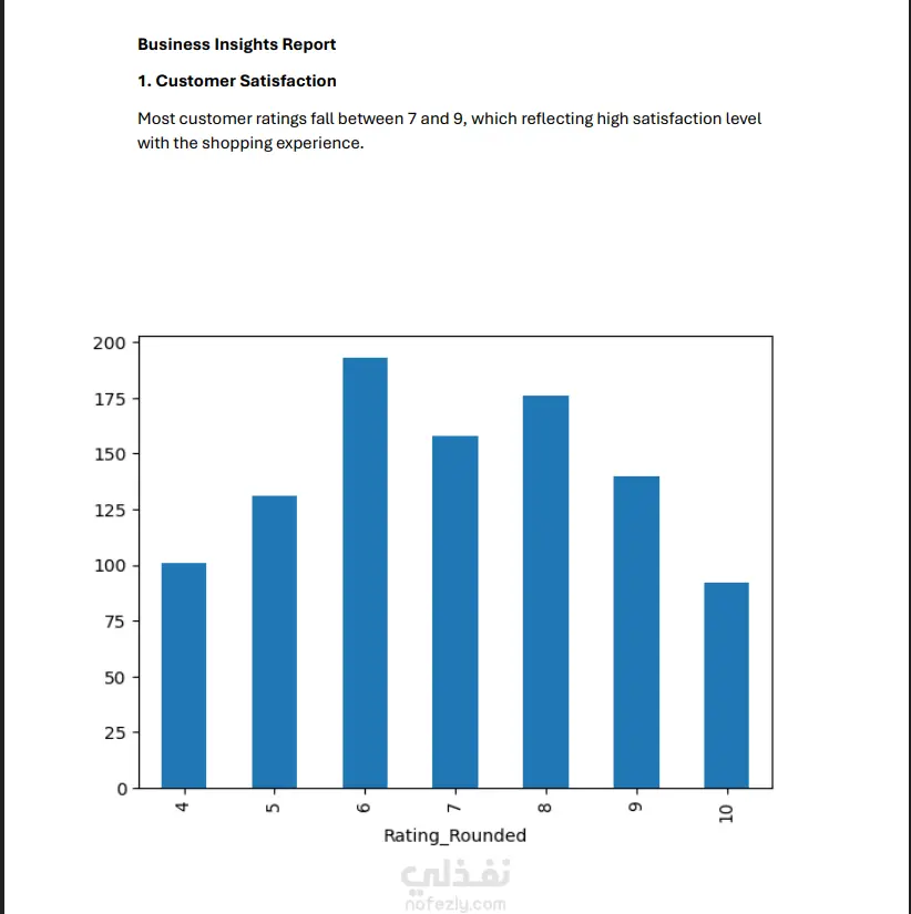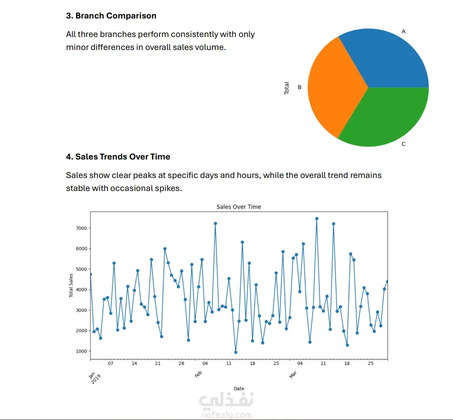 يتكوّن المشروع من مرحلتين رئيسيتين: تنظيف البيانات (Data Wrangling): تم جمع بيانات المبيعات الخاصة بمتجر من ملف CSV، ثم تنظيفها باستخدام مكتبة pandas في Python. شمل ذلك إزالة القيم المكررة والمفقودة، تعديل أنواع البيانات، واكتشاف القيم الشاذة باستخدام طريقة IQR، بالإضافة إلى إنشاء أعمدة جديدة مثل إجمالي الفاتورة والضريبة. النتيجة كانت قاعدة بيانات جاهزة للتحليل والتصوّر. تحليل الأداء واستخلاص الرؤى (Business Insights): بعد تجهيز البيانات، تم تحليلها لاستخراج مؤشرات الأداء الرئيسية. أبرز النتائج: رضا العملاء مرتفع (تقييمات بين 7 و9). منتجات الأغذية والمشروبات والإكسسوارات هي الأعلى مبيعًا وتقييمًا. الأداء متقارب بين الفروع الثلاثة. المبيعات تتفاوت حسب الأيام والساعات مع وجود ذروات زمنية محددة. هذا المشروع يبرز مهاراتي في تنظيف البيانات وتحليلها واستخلاص التوصيات العملية باستخدام أدوات تحليل البيانات.