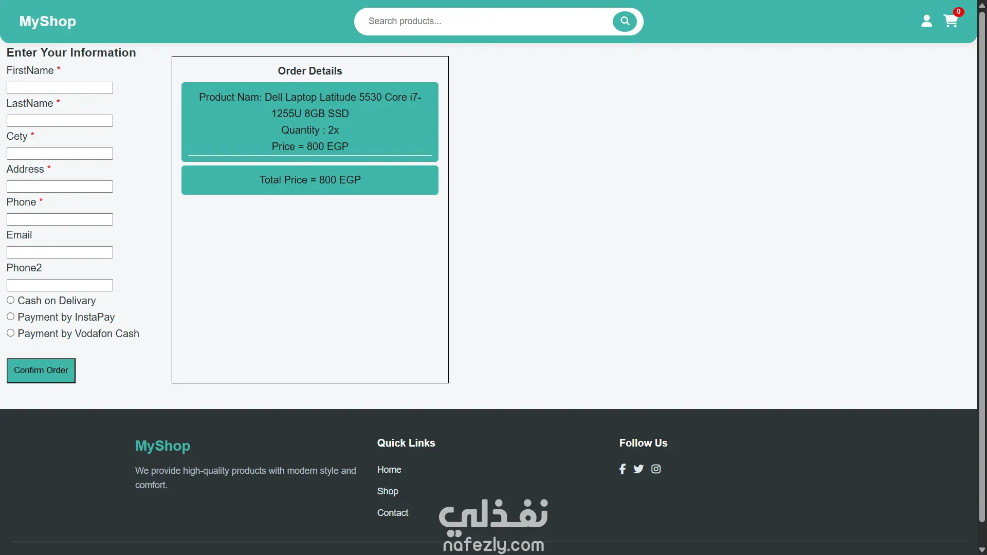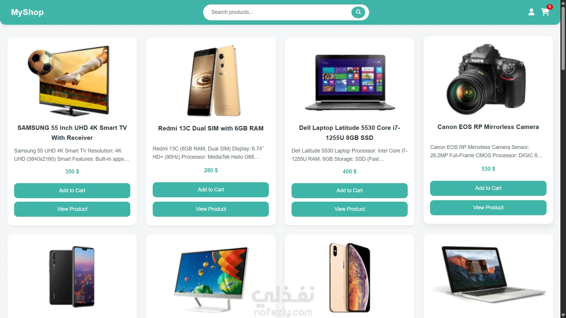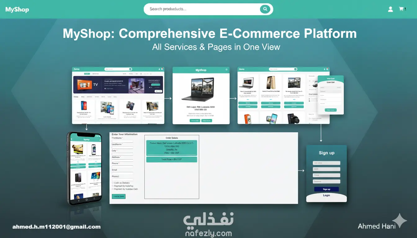 MyShop هو متجر إلكتروني شامل صممته وطورته بالكامل. يهدف المشروع إلى توفير تجربة تسوق سهلة وممتعة للمستخدمين، مع التركيز بشكل خاص على التصميم المتجاوب (Responsive Design) لضمان عمله بسلاسة على كافة الأجهزة (سطح المكتب، التابلت، الهواتف الذكية). الميزات الرئيسية في المشروع: - الصفحة الرئيسية للمنتجات: عرض جذاب للمنتجات مع تفاصيل مختصرة وخيار الإضافة للسلة. (كما يظهر في Screenshot 73 & 74). - صفحة تفاصيل المنتج: عرض كامل للمواصفات مع خيار "أضف إلى السلة" و"رجوع". (كما يظهر في Screenshot 75). - عربة التسوق (Cart): سلة جانبية تفاعلية لعرض وتعديل المنتجات المضافة قبل إتمام الشراء. (كما يظهر في Screenshot 74). - صفحتا التسجيل والدخول: تصميم عصري وواضح لصفحتي Sign Up و Login باستخدام CSS و Bootstrap لتجربة مستخدم سلسة. (كما يظهر في Screenshot 77 & 78). - صفحة إنهاء الطلب (Checkout): نموذج لإدخال بيانات العميل وعرض ملخص الطلب وطرق الدفع (نقداً عند الاستلام، InstaPay، فودافون كاش). (كما يظهر في Screenshot 76). التقنيات والمهارات التي استخدمت في تطوير المشروع: - HTML5: لبناء هيكل صفحات الويب. - CSS3: للتنسيق والتصميم الجذاب. - Bootstrap 5: لضمان التصميم المتجاوب (Responsive) وسرعة البناء. - JavaScript (أو Java كما ذكرت): لإضافة التفاعلية وإدارة الأحداث (مثل إضافة المنتج للسلة، وظيفة البحث). - Responsive Web Design: تم تطوير المشروع ليعمل بكفاءة على جميع أحجام الشاشات.