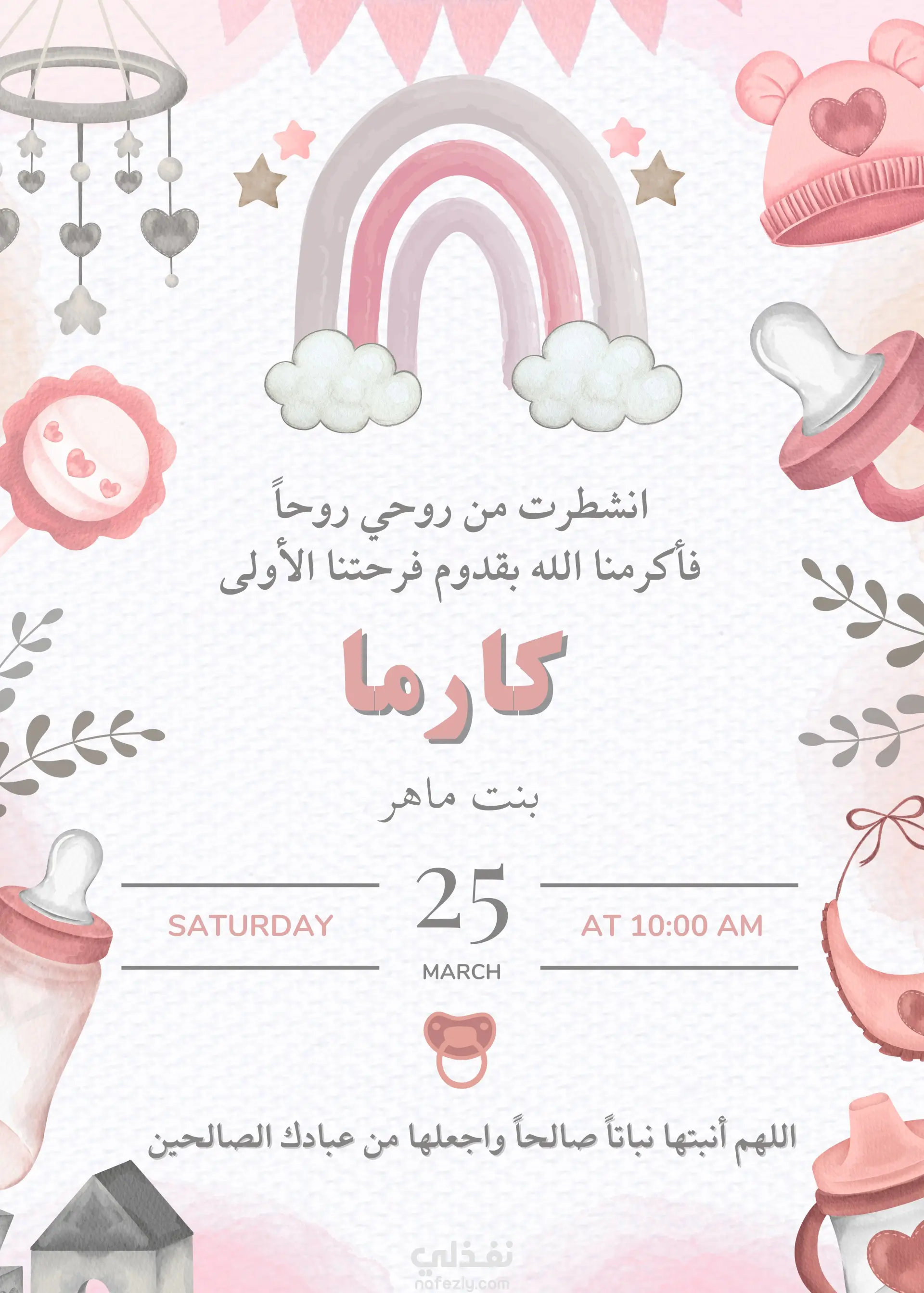 تصميم تهنئة بمناسبة قدوم مولودة جديدة بأسلوب ناعم ومبهج يعبّر عن الفرح والحب، مع لمسات أنثوية بسيطة تعكس روح المناسبة. يمكن تعديل التصميم بسهولة ليُستخدم كـ دعوة زفاف أو دعوة لحفل خاص مثل أعياد الميلاد أو المناسبات العائلية. التصميم متناسق الألوان، جاهز للطباعة أو النشر الإلكتروني، ويمنح كل مناسبة لمسة فنية مميزة تعبّر عن ذوق أصحابها.