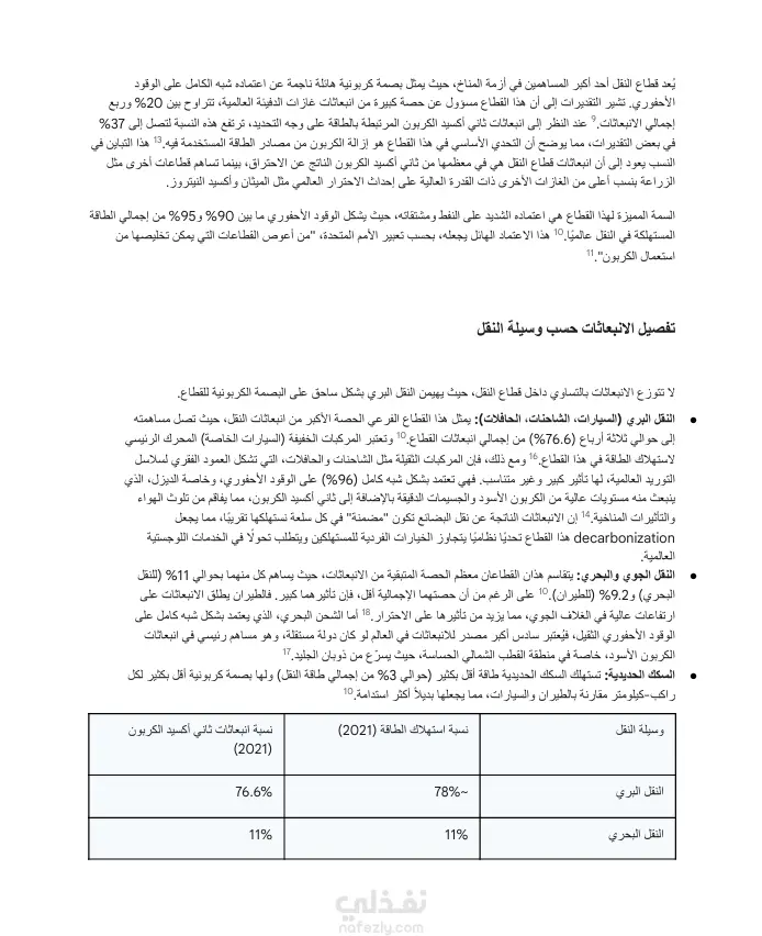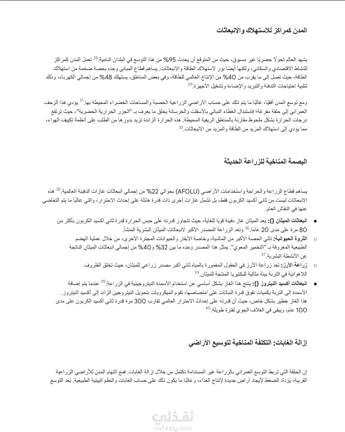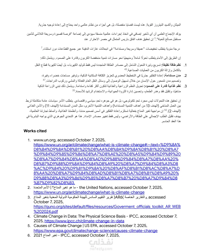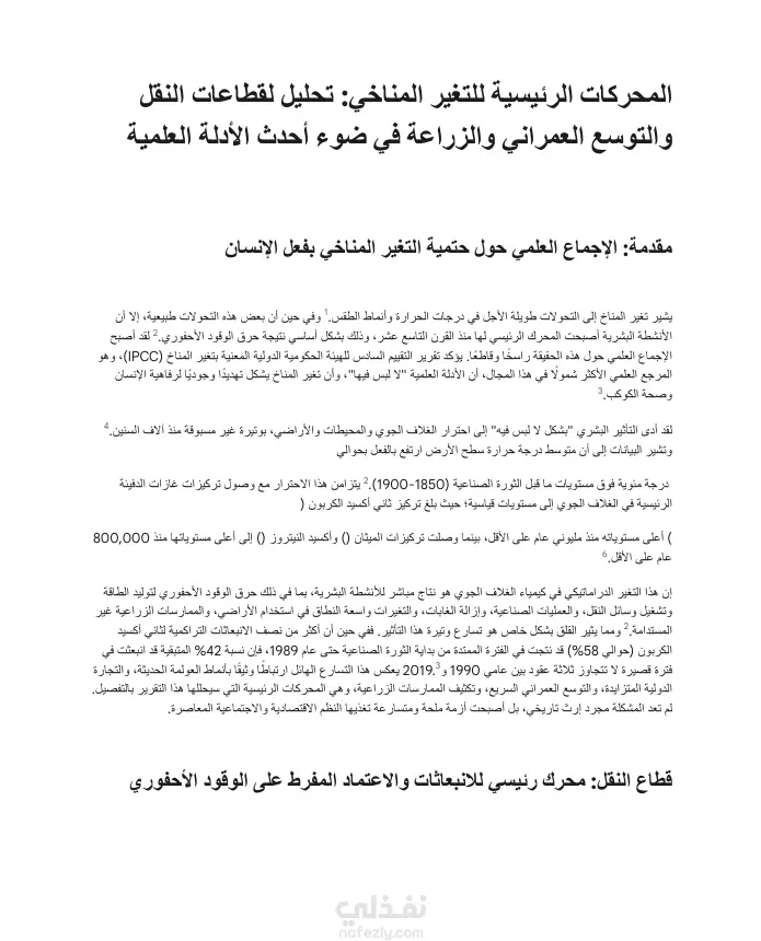 تقرير علمي معمق حول أسباب التغير المناخي هذا المشروع هو عبارة عن تقرير تحليلي شامل بعنوان "المحركات الرئيسية للتغير المناخي: تحليل لقطاعات النقل والتوسع العمراني والزراعة في ضوء أحدث الأدلة العلمية". يُعد هذا التقرير مثالًا ممتازًا على قدرتي على إجراء بحث معمق وتلخيص معلومات علمية معقدة في وثيقة واضحة ومنظمة بشكل جيد. يُظهر هذا التقرير خبرة في: البحث العميق والتلخيص: يستند العمل إلى مصادر علمية موثوقة، وعلى رأسها نتائج الهيئة الحكومية الدولية المعنية بتغير المناخ (IPCC)، مما يؤكد أن التأثير البشري هو السبب القاطع للاحترار العالمي. التحليل القطاعي المتخصص: يقدم التقرير تفصيلًا دقيقًا للقطاعات الرئيسية المسؤولة عن انبعاثات غازات الدفيئة: قطاع النقل: تحليل اعتماده الهائل على الوقود الأحفوري (90-95% من طاقته) ، وتحديد النقل البري كمصدر لنحو 77% من انبعاثات القطاع. التوسع العمراني والزراعة: ربط الزحف العمراني بزيادة الطلب على الطاقة والانبعاثات ، وتوضيح كيف يساهم قطاع الزراعة بنحو 22% من إجمالي الانبعاثات من خلال غاز الميثان (CH 4) الناتج عن الثروة الحيوانية وأكسيد النيتروز (N 2O) الناتج عن استخدام الأسمدة. المحتوى المدعوم بالبيانات: التقرير معزز ببيانات دقيقة، مثل حقيقة أن التوسع الزراعي مسؤول عن أكثر من 80% من إزالة الغابات في العالم. الوضوح والتنظيم: تم عرض المعلومات بمنطقية، بدءًا بالإجماع العلمي ثم دراسة كل قطاع مؤثر على حدة، مما يجعل الموضوعات المعقدة سهلة الفهم لجمهور أوسع. خاتمة موجهة نحو الحلول: يختتم التقرير ليس فقط بتحليل المشكلة، بل باقتراح استراتيجيات متكاملة للانتقال نحو مسارات تنمية منخفضة الكربون وقادرة على الصمود. يعرض هذا المشروع قدرتي على تقديم تقارير عالية الجودة، قائمة على بحث دقيق، ومكتوبة بأسلوب احترافي يناسب الأغراض الأكاديمية أو الإعلامية أو المتعلقة بالسياسات العامة.