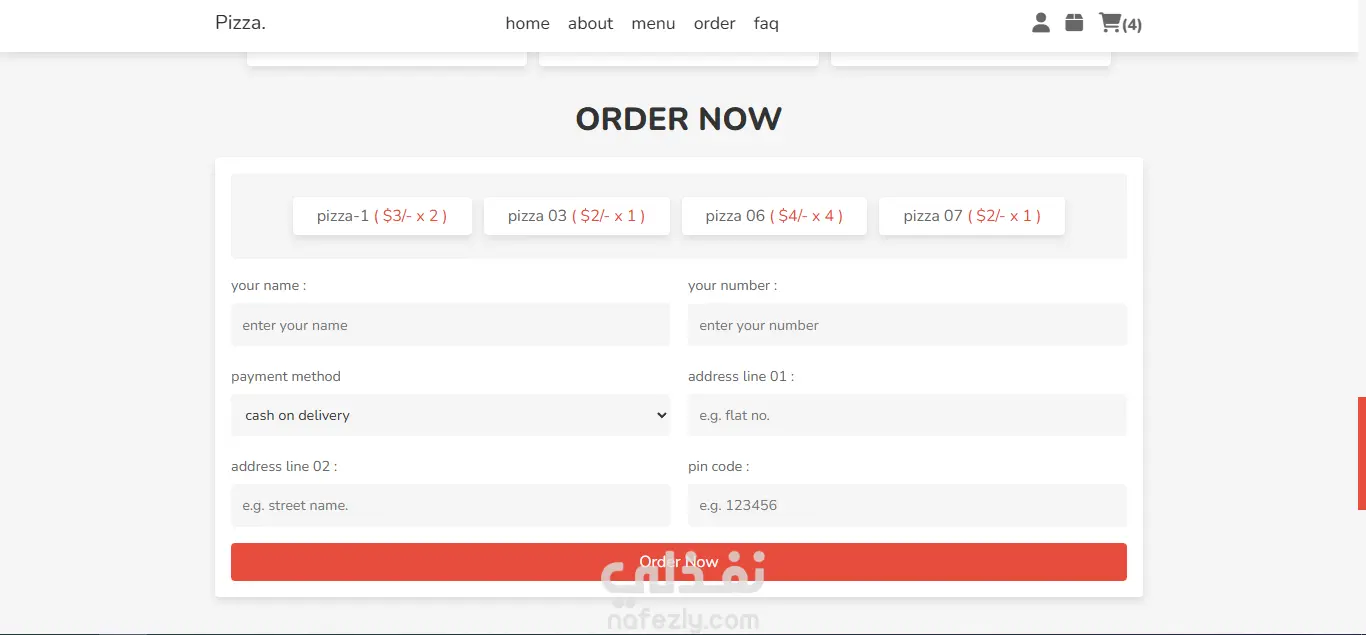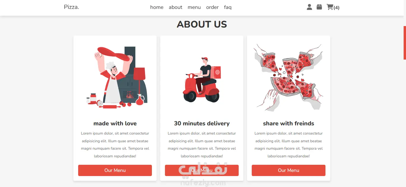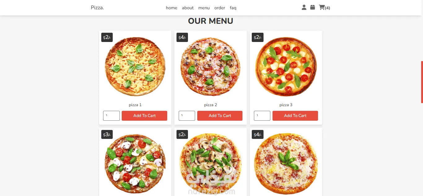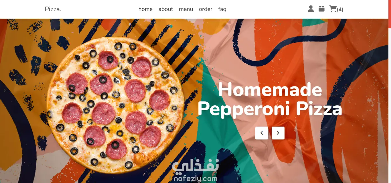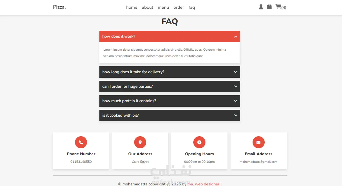 تصميم وتنفيذ موقع مطعم بيتزا بسيط وجذاب يحتوي على صفحة رئيسية، قائمة الطعام، وقسم تواصل. يكون التصميم متجاوب مع جميع الأجهزة وباستخدام HTML, CSS, وJavaScript