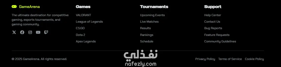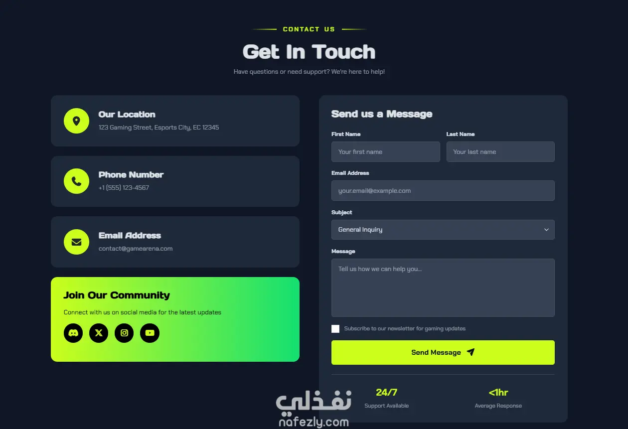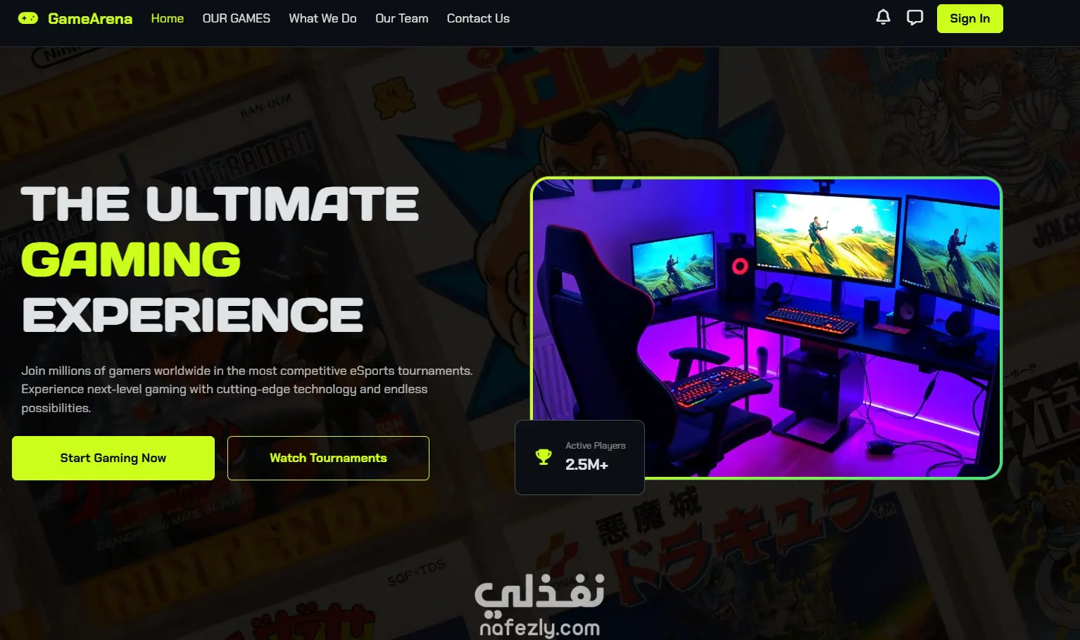 GameArena is a modern, responsive gaming website showcasing the latest games, eSports tournaments, and team members — designed with a futuristic dark theme and neon highlights. 🚀 Features 🎨 Modern UI/UX Design – Futuristic dark layout with glowing accents 🧱 Built with Bootstrap 5 – Fully responsive and grid-based 🕹️ Interactive Hero Section – Dynamic call-to-action buttons and hero image 🧩 Carousel for Games – Showcase multiple games using Bootstrap carousel 🧑🤝🧑 Team Members Section – Stylish player cards with hover effects 💬 Contact Form – Newsletter checkbox and styled form validation 🏆 Sponsors Section – Auto-scrolling logo animation 🛠️ Technologies Used HTML5 CSS3 Bootstrap 5 Font Awesome Google Fonts (Days One & Chakra Petch)