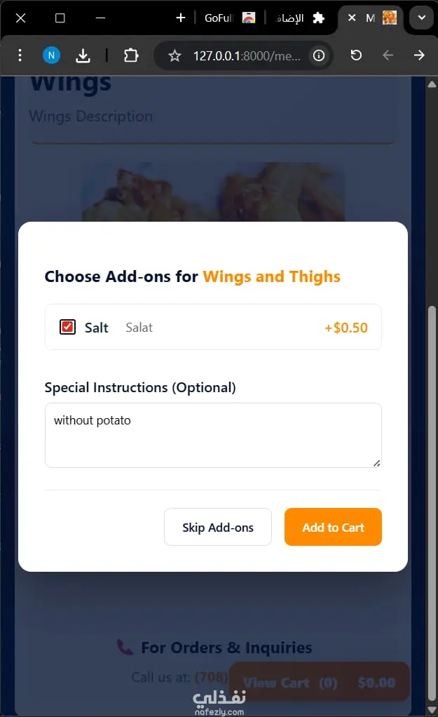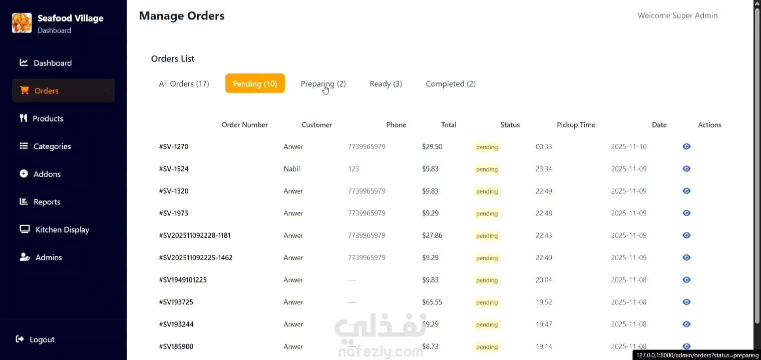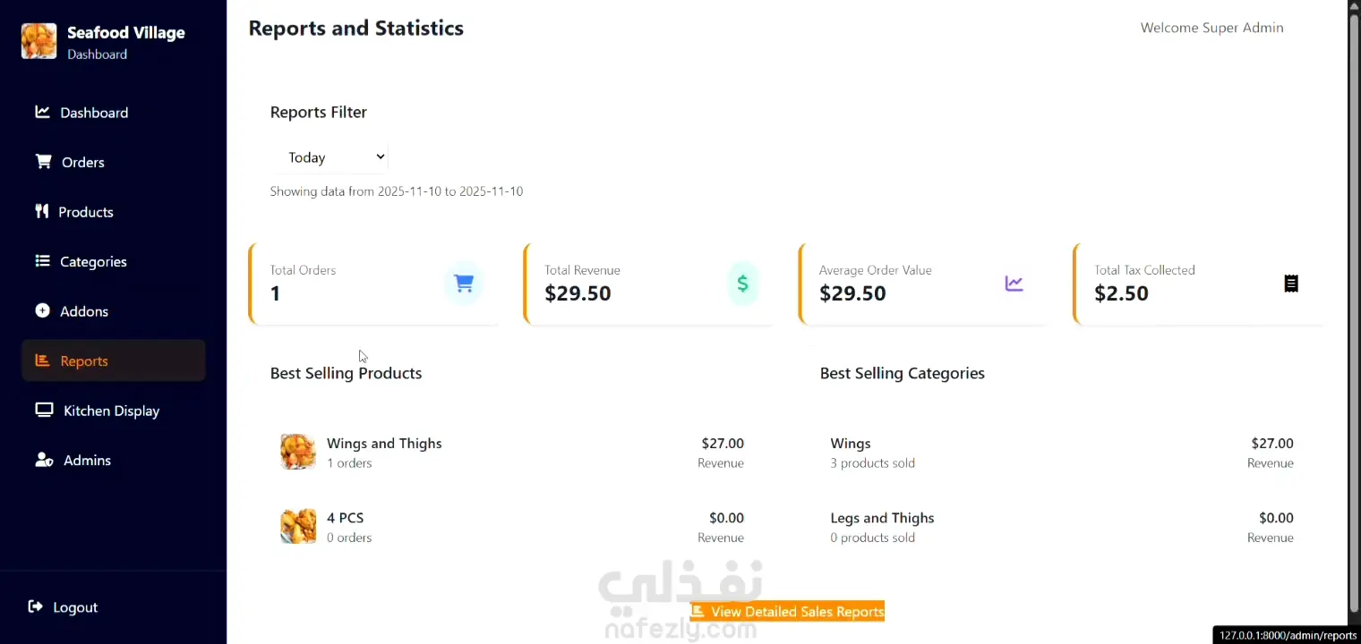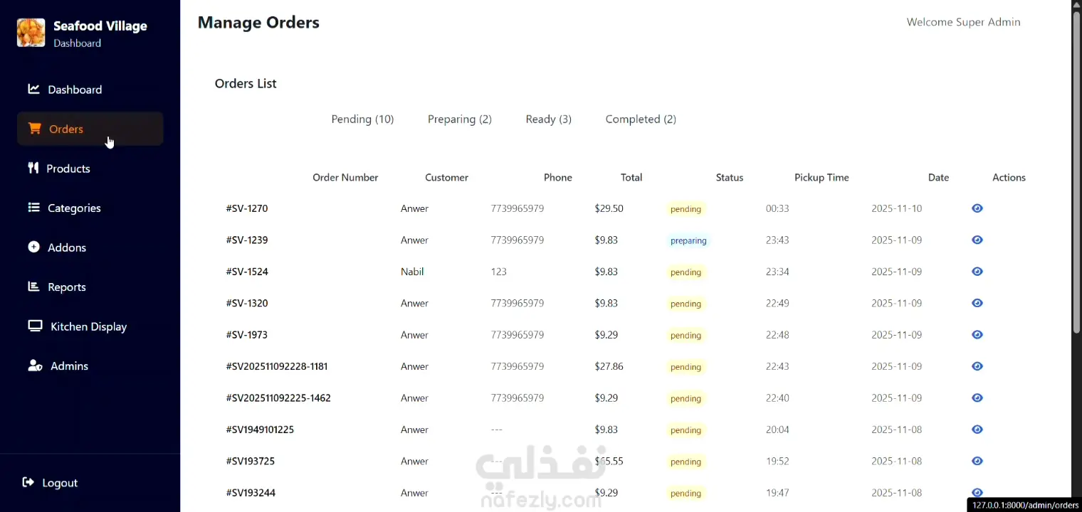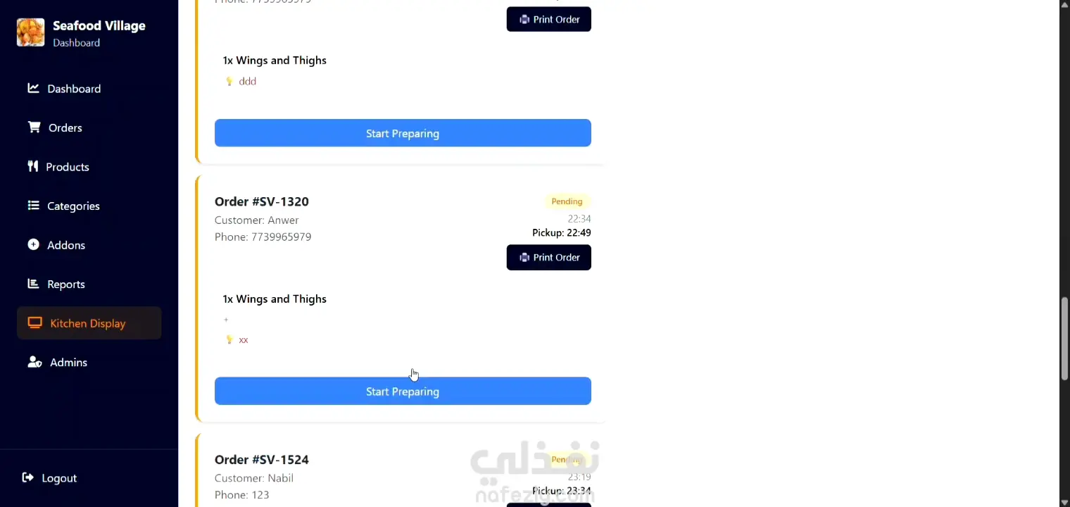 نظرة عامة عن المشروع الفكرة الأساسية: نظام طلبات متكامل لمطعم Seafood Village في ولاية إلينوي الأمريكية، يسمح للعملاء بحجز طلباتهم مسبقاً عبر الإنترنت وتجهيزها قبل وصولهم، مما يلغي فترات الانتظار الطويلة ويحسن تجربة العملاء. الهدف الاستراتيجي: تحويل العملية التقليدية للطلب في المطاعم إلى تجربة رقمية سلسة، تزيد من كفاءة العمليات وتحسن رضا العملاء وتزيد الإيرادات. تفاصيل الموقع والمطعم المعلومات الأساسية: · الاسم: Seafood Village · الشعار: "Bold • Fresh • Fast" · التخصص: الوجبات السريعة · الموقع: 10S634 Kingery Hwy Willowbrook, IL 60527 · الهاتف: (773) 996-5979 · أوقات العمل: · الإثنين - الخميس: 10:00 ص - 11:00 م · الجمعة - السبت: 10:00 ص - 09:00 م شرح تفصيلي لواجهات النظام 1. الصفحة الرئيسية (Home) الوظيفة: واجهة الترحيب الرئيسية وتعريف بالمطعم 2. صفحة من نحن (About) الوظيفة: بناء الثقة والتعريف بقصة المطعم 3. صفحة الاتصال (Contact) الوظيفة: توفير قنوات اتصال متعددة 4. صفحة القائمة (Menu) الوظيفة: عرض المنتجات واتاحة الطلب المحتوى: · تصنيفات المنتجات (مقبلات، أطباق رئيسية، مشروبات) · صور ووصف كل منتج · الأسعار · خيارات الإضافات والتخصيص · وقت التحضير المقدر 5. سلة التسوق (Cart) الوظيفة: إدارة الطلبات والتجهيز للدفع المحتوى: · عرض العناصر المختارة · تعديل الكميات · إضافة ملاحظات خاصة · حساب الإجمالي والضرائب · معلومات العميل للاستلام 6. لوحة التحكم (Admin Dashboard) وظائف الإدارة الرئيسية: إدارة المنتجات (CRUD) · إضافة/تعديل/حذف المنتجات · إدارة الصور والوصف · تحديد الأسعار والتوفر · إدارة وقت التحضير إدارة التصنيفات (CRUD) · تنظيم المنتجات في فئات · ترتيب العرض · إدارة الصور الترويجية للفئات إدارة الإضافات (Extras CRUD) · الصلصات الإضافية · المقبلات الجانبية · خيارات التخصيص · إدارة أسعار الإضافات إدارة الطلبات (Orders) · عرض الطلبات الجديدة · تحديث حالة الطلب · إدارة وقت الاستلام · معالجة الإلغاءات شاشة المطبخ (Kitchen Display) · عرض الطلبات حسب وقت الطلب · تحديث حالة التحضير · إشعارات الطلبات العاجلة · طباعة تذاكر الطهي إدارة المشرفين (Admin CRUD) · إدارة صلاحيات الموظفين · تتبع نشاط المستخدمين · إعدادات النظام التقارير (Reports) تقارير المبيعات: · مبيعات يومية/أسبوعية/شهرية · المنتجات الأكثر مبيعاً · أوقات الذروة · تحليل الإيرادات تقارير الأداء: · متوسط وقت التحضير · معدل الإشغال · تحليل العملاء · تقييمات ومراجعات الجانب التقني التقنيات المستخدمة: · Backend: PHP/Laravel · Frontend: HTML, CSS, JavaScript · Database: MySQL مميزات النظام: · ✅ تصميم متجاوب (Responsive) · ✅ تحسين لمحركات البحث (SEO) · ✅ تحليل البيانات في الوقت الحقيقي · ✅ إشعارات الطلبات الفورية · ✅ تقارير أداء شاملة · ✅ إدارة متعددة المستخدمين معلومات الاتصال للمشروع: · المطور: Nabil Fayez · البريد الإلكتروني: [email protected] · تاريخ الإنجاز: 10/11/2025 · الحالة: ✅ مكتمل وجاهز للتشغيل