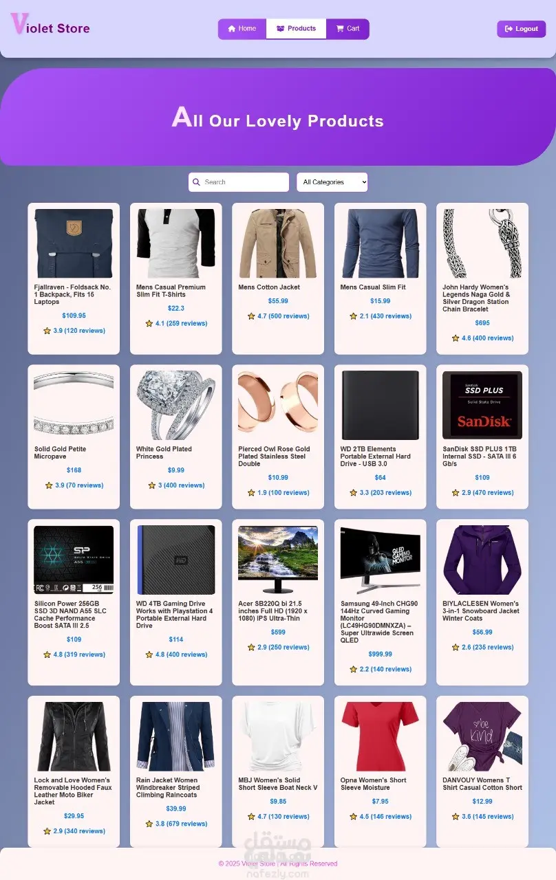 "Violet Store" هو مشروع متجر إلكتروني حديث مصمم بواجهة جذابة وسهلة الاستخدام، يتيح للمستخدمين تصفح وشراء منتجات متنوعة تشمل الملابس، الإكسسوارات، الإلكترونيات، والمجوهرات. تم تطوير المنصة باستخدام javascript مع التركيز على تجربة المستخدم وسهولة التنقل