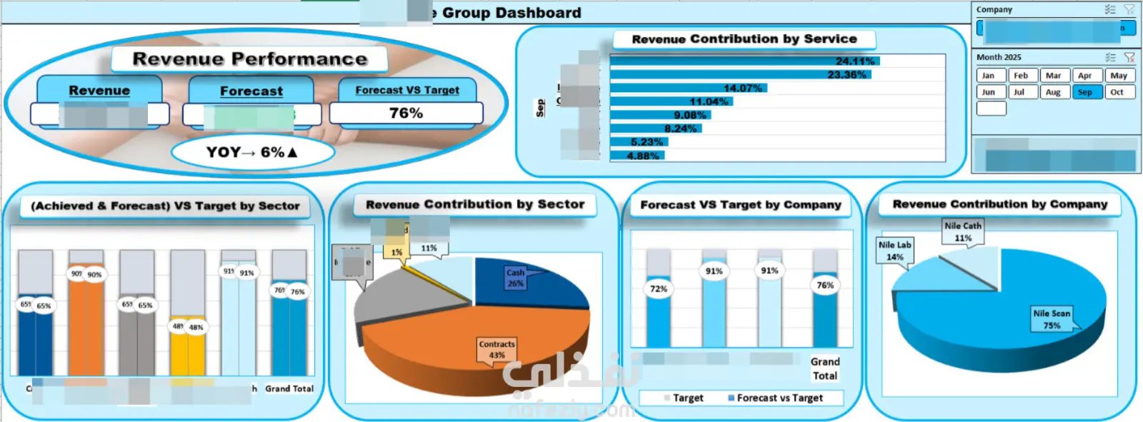 لوحه تحكم ديناميكيه لمجموعه شركات لمتابعه الاداء مقارنه بالتارجت والمتوقع مع مقارنه بنفس الفتره العام السابق مقسمه بالشركات والقطاعات والخدمات