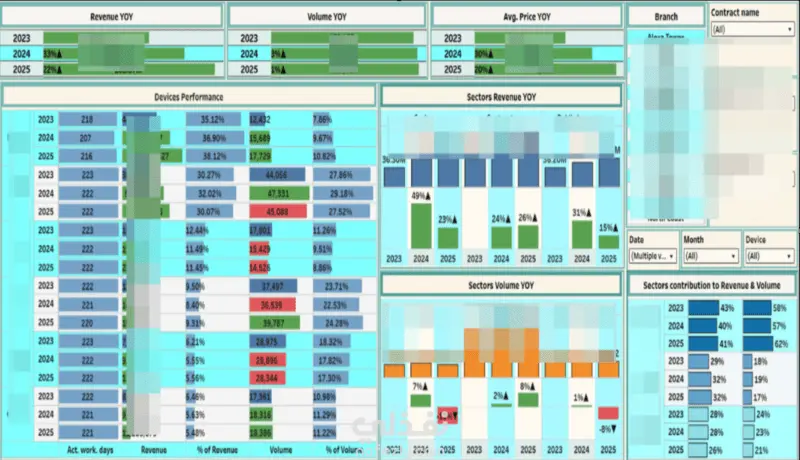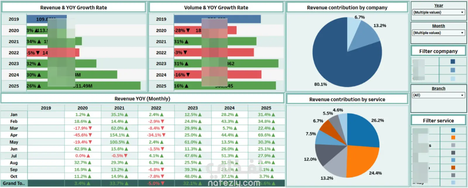 داشبورد تفاعلية باستخدام تابلوه لعرض أداء الشركه مقارنه بالسنوات السابقه على مستوى الإيرادات والاعداد مقسمه بالقطاعات والفروع والخدمات مما يسهل تحديد نقاط القوه والضعف وإظهار التفاصيل الخاصه بالقطاعات والخدمات والفروع مما يسهل ويعمل على تحسين الأداء والمساهمه فى اتخاذ القرار كما انها مصممه بشكل ديناميكى يمكنني من تحديد الفتره الزمنيه او الخدمات او الفروع المطلوب مقارنتها وتحليلها