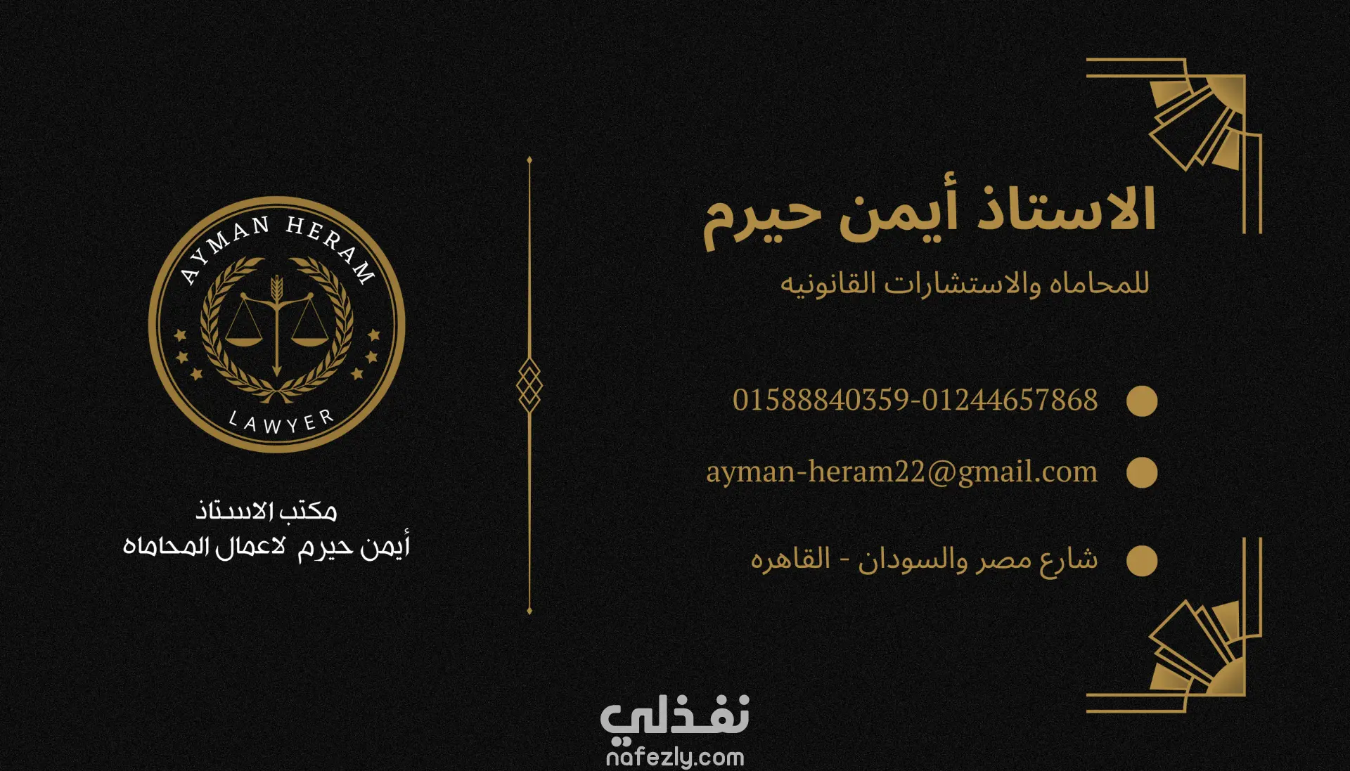 تصميم شعار لمكتب خاص باعمال المحاماه باستخدام برنامج ادوبي اليستريتور تصميم كارت شخصي لصاحب المكتب توحيد الالوان بين الشعار والكارت الشخصي للحفاظ علي الهويه البصريه