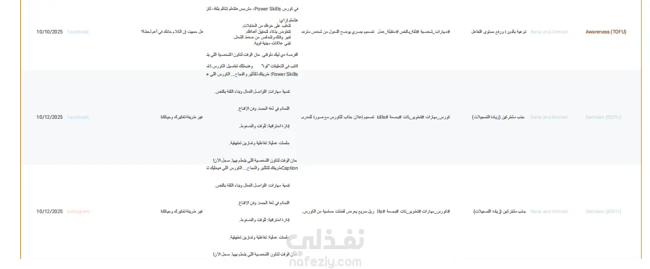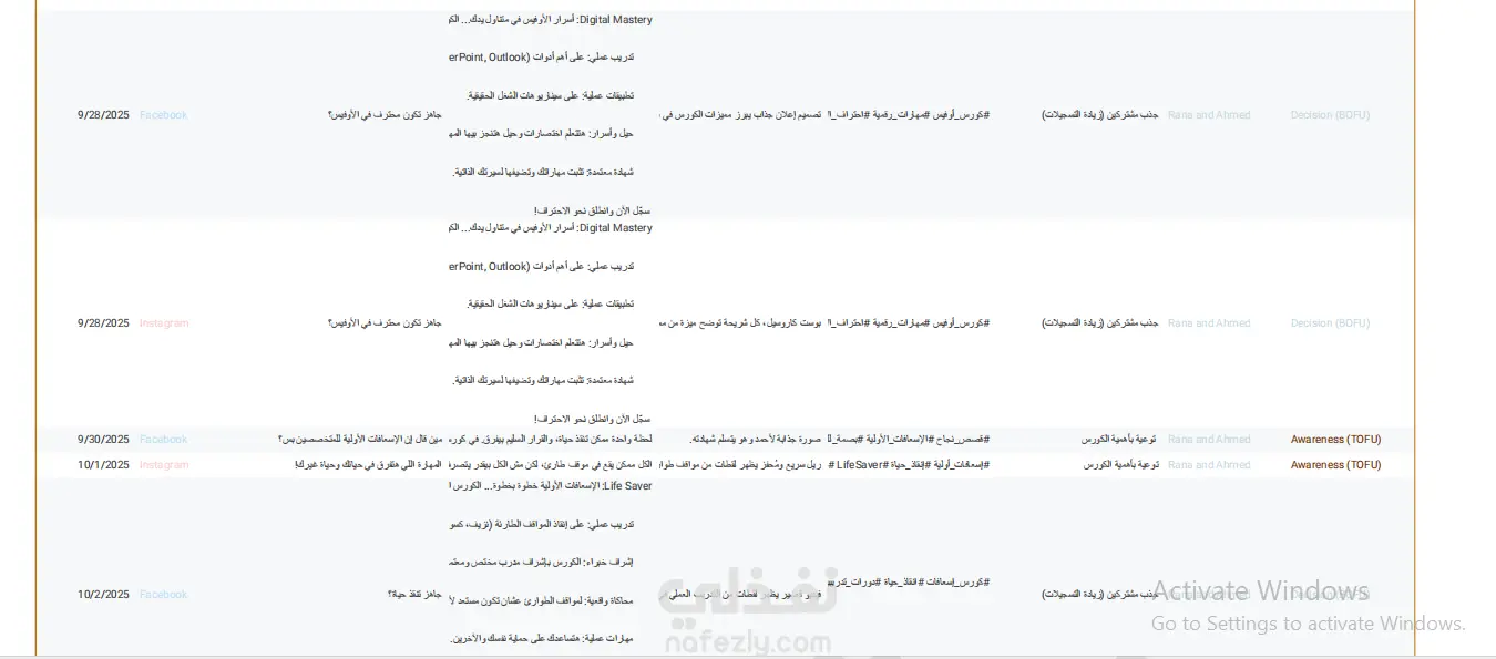 مرحلة اتخاذ القرار (Decision): إطلاق منشورات دعائية مباشرة (Call to Action) تحفز على التسجيل الفوري في الكورسات، مع إبراز المميزات التنافسية مثل الشهادات المعتمدة والتدريب العملي.