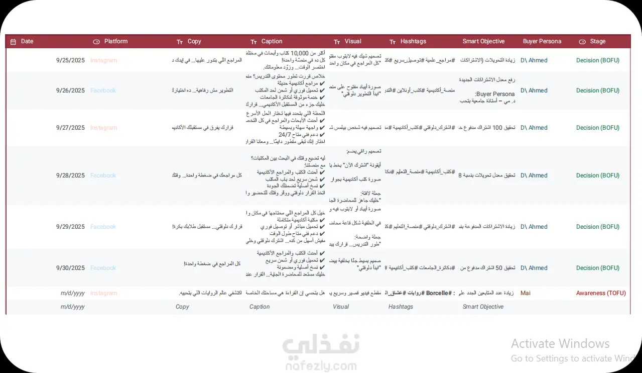 تحليل السوق وتحديد شخصيات المشتري (Buyer Personas): قمت بتحديد ثلاث شرائح رئيسية للجمهور: "مي" (قارئة الروايات الشغوفة)، "محمد" (ولي الأمر المسؤول عن شراء الكتب المدرسية)، و"د. أحمد" (الأستاذ الجامعي الباحث عن المراجع).