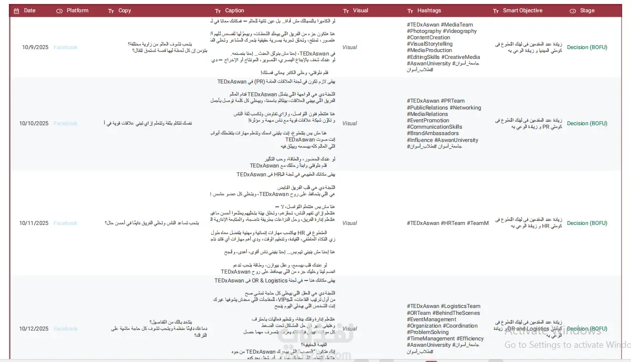 بناء استراتيجية المحتوى: وضعت خطة محتوى متكاملة تغطي جميع مراحل التسويق (TOFU, MOFU, BOFU)، مع تصميم أفكار منشورات متنوعة (صور، فيديوهات، كاروسيل) لكل شريحة من الجمهور.