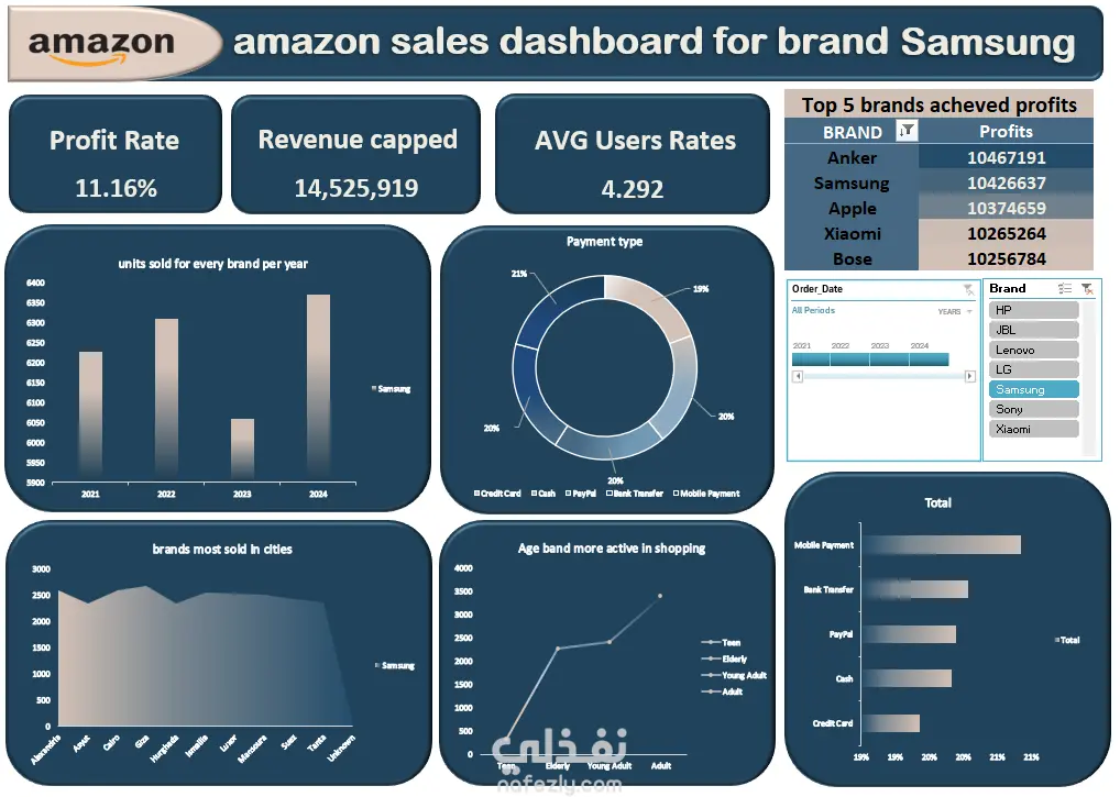 تم تطوير لوحة تحكم تفاعلية لتحليل أداء مبيعات علامة Samsung على منصة Amazon بهدف تتبع الأرباح، ومعدلات رضا المستخدمين، وأنماط الدفع، والفئات الأكثر نشاطًا في الشراء. تساعد هذه اللوحة في تحديد الاتجاهات التسويقية ومقارنة أداء سامسونج مع العلامات التجارية المنافسة. الأدوات المستخدمة: Microsoft Excel / Power BI Pivot Tables & Charts Interactive Filters (Slicers) Data Cleaning باستخدام Power Query المؤشرات الرئيسية (KPIs): معدل الأرباح (Profit Rate): 11.16% إجمالي الإيرادات (Revenue): 14,525,919 متوسط تقييم المستخدمين (AVG User Rate): 4.29 التحليلات داخل الـ Dashboard: 📈 تحليل المبيعات عبر السنوات (2021–2024): يُظهر نموًا في المبيعات عام 2024 مقارنة بالسنوات السابقة. 💳 أنواع طرق الدفع (Payment Type): توزع بين Credit Card، PayPal، Bank Transfer، وMobile Payment. 🏙️ المدن الأعلى مبيعًا: عرض لأكثر المدن التي حققت مبيعات لمنتجات سامسونج. 👥 تحليل الفئات العمرية النشطة في الشراء: الفئة الأكثر نشاطًا هي الشباب (Young Adults). 🏆 العلامات التجارية الأعلى أرباحًا: Anker – 104,671,91 Samsung – 104,266,37 Apple – 103,746,59 Xiaomi – 102,652,64 Bose – 102,567,84 القيمة المضافة: تساعد هذه اللوحة الشركات في تحليل اتجاهات المبيعات، تحديد سلوك العملاء، وتوجيه قرارات التسويق المستقبلية لزيادة الإيرادات وتعزيز رضا العملاء.