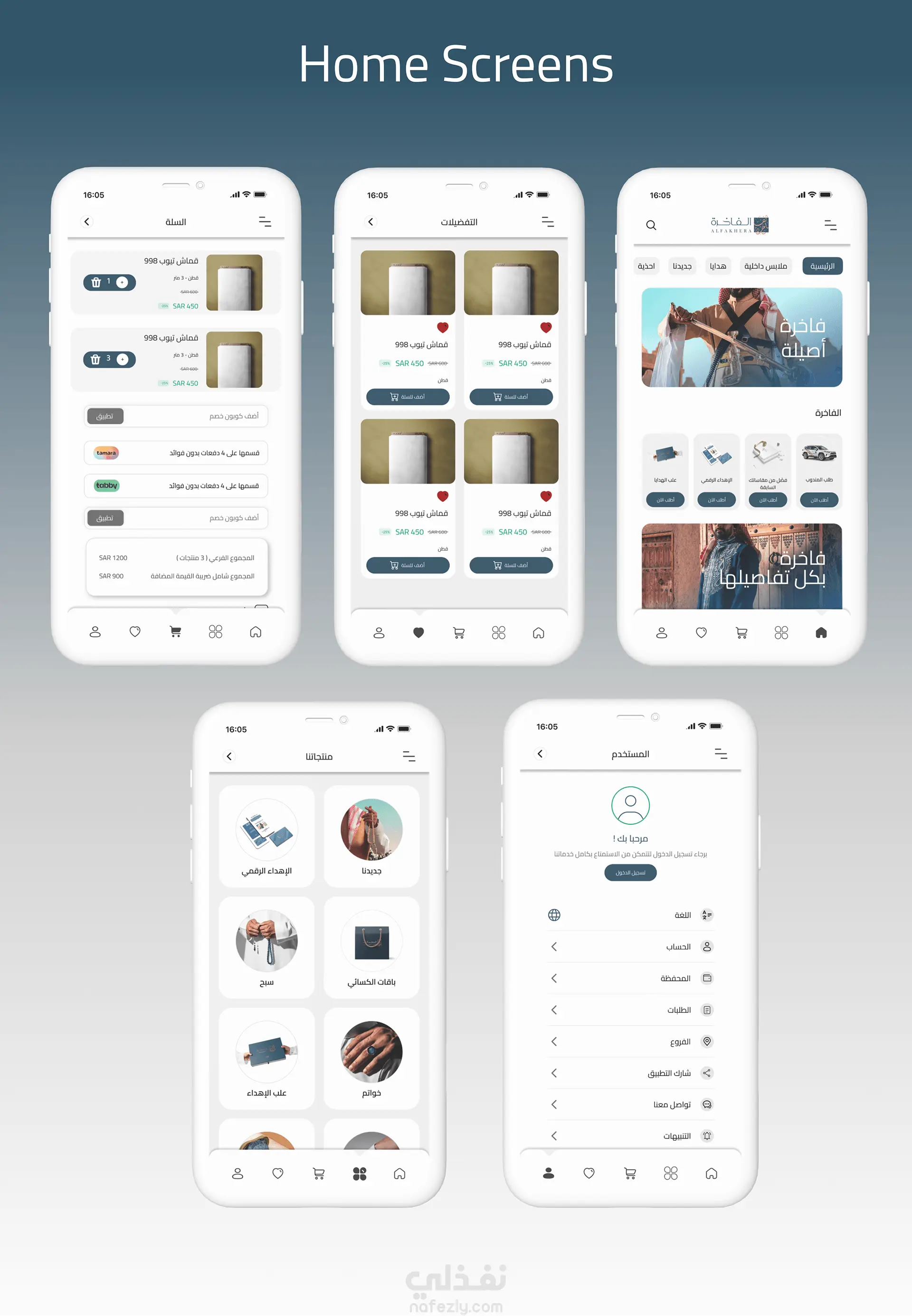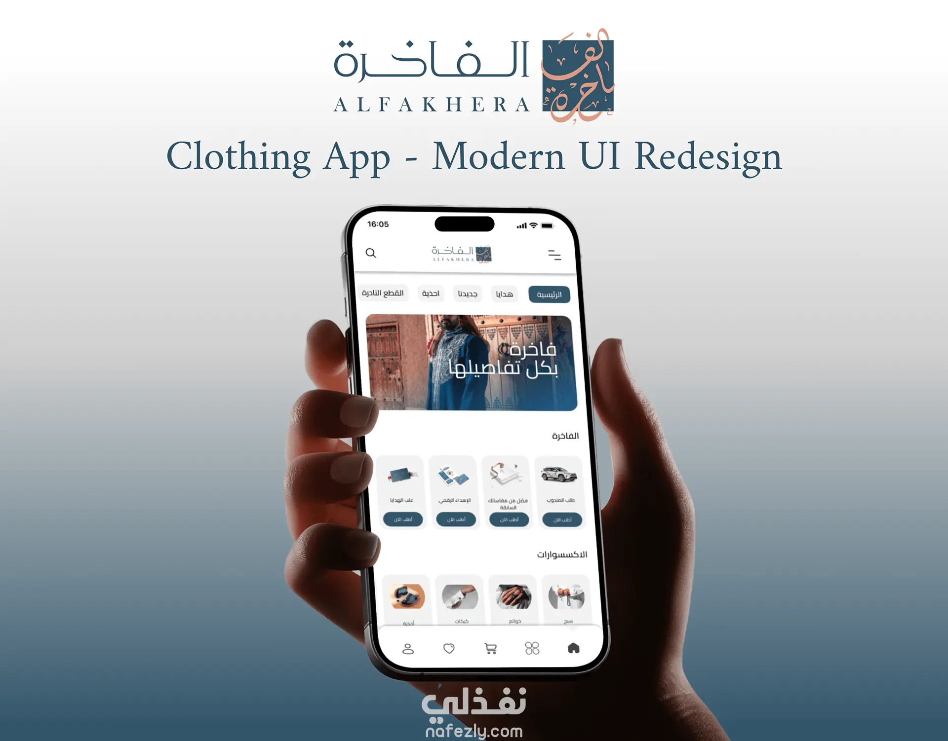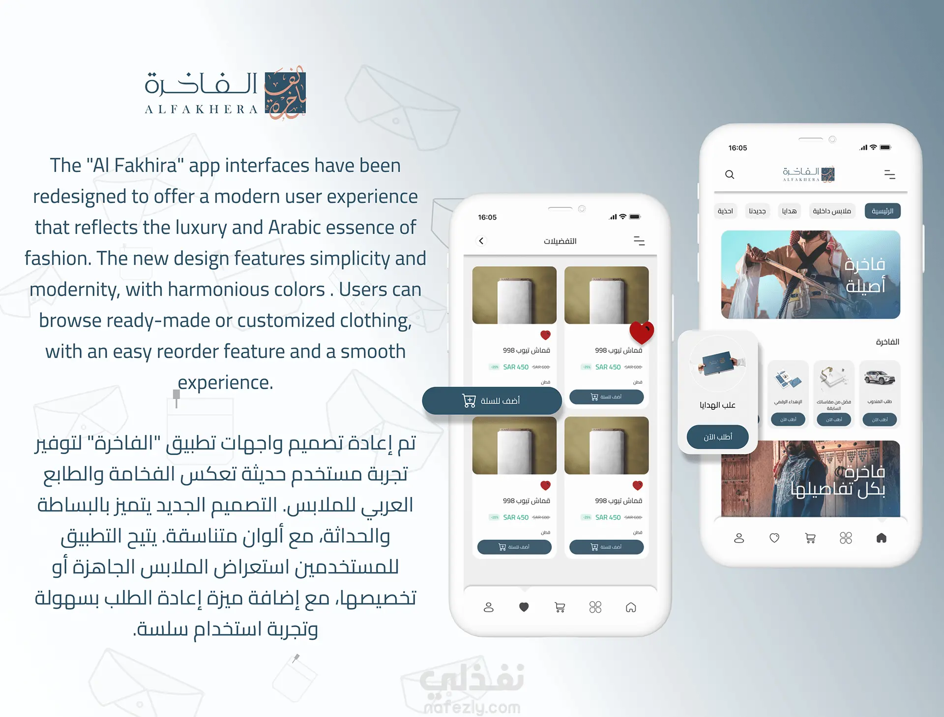 تم إعادة تصميم واجهات تطبيق "الفاخرة" لتوفير تجربة مستخدم حديثة تعكس الفخامة والطابع العربي للملابس. التصميم الجديد يتميز بالبساطة والحداثة، مع ألوان متناسقة. يتيح التطبيق للمستخدمين استعراض الملابس الجاهزة أو تخصيصها، مع إضافة ميزة إعادة الطلب بسهولة وتجربة استخدام سلسة.