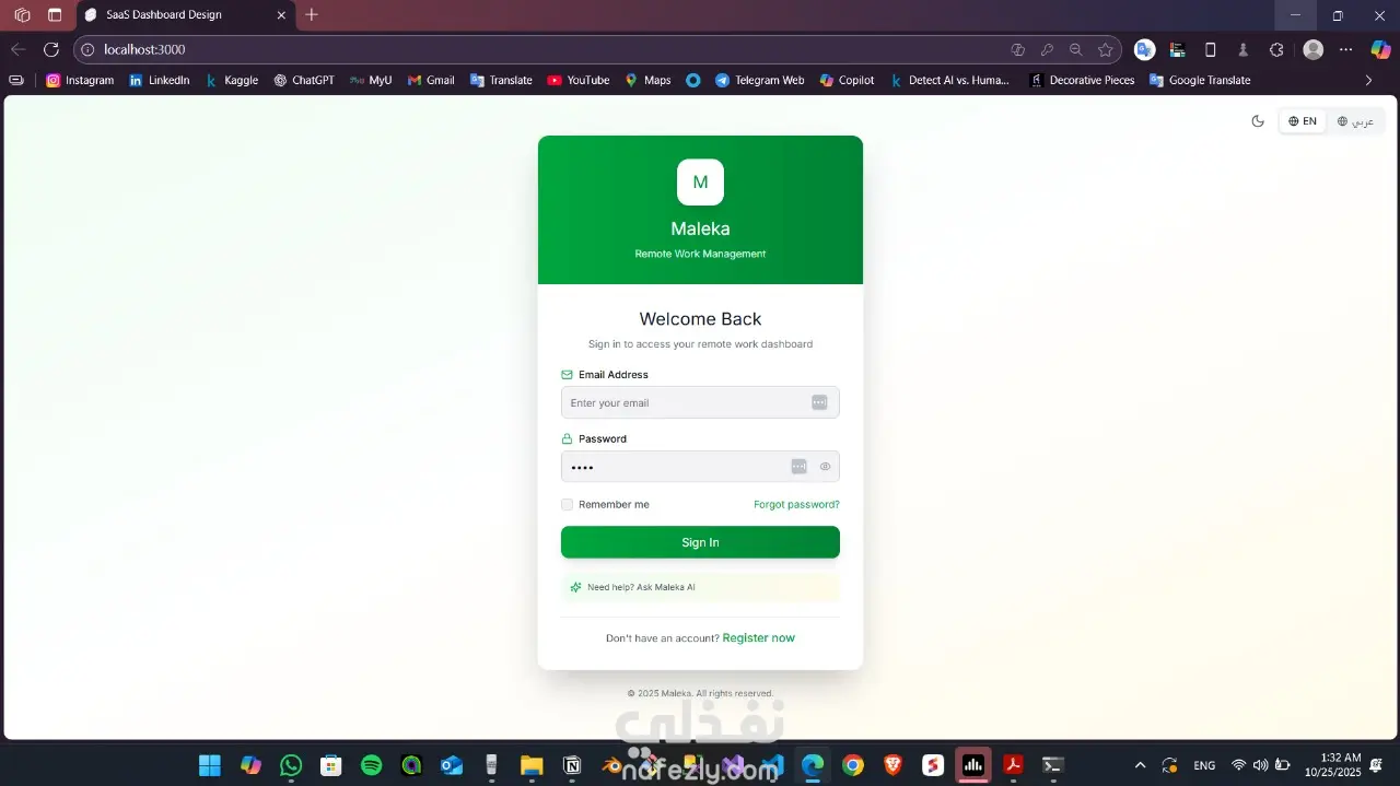 • Backend – ASP.NET Core (.NET 8): تم استخدام ASP.NET Core لبناء جانب الخادم، حيث يوفر إطار عمل قوي ومرن لتطوير واجهات برمجة التطبيقات (APIs) باستخدام ASP.NET Core Web API. يتم من خلاله إدارة المستخدمين، المهام، المشاريع، والاجتماعات داخل منصة العمل عن بُعد، مع أداء عالٍ وأمان متكامل ودعم ممتاز للتكامل مع أنظمة مختلفة. • Frontend – React: تم استخدام React لتطوير واجهة المستخدم التفاعلية، مما يتيح تجربة سلسة وسريعة لإدارة المهام، عرض المشاريع، حضور الاجتماعات الافتراضية، والتواصل الفوري بين أعضاء الفريق. كما تم ربط React مع واجهات الـ API الخاصة بـ .NET عبر بروتوكول RESTful APIs لضمان تدفق البيانات بشكل آمن وسريع. • Database – SQL Server أو MySQL: تم الاعتماد على قاعدة بيانات علائقية مثل Microsoft SQL Server (أو MySQL) لتخزين بيانات المستخدمين، المهام، الملفات، الحضور، والتقارير اليومية الخاصة بالعمل عن بُعد. تم ربط قاعدة البيانات بالخادم باستخدام Entity Framework Core لتسهيل التعامل مع البيانات بطريقة كائنية (ORM). • Authentication – نظام صلاحيات (Role-Based Authentication): تم تنفيذ نظام تسجيل دخول وصلاحيات باستخدام ASP.NET Identity بحيث يتم تحديد صلاحيات كل مستخدم حسب دوره داخل المنصة، مثل: المدير (Admin / Manager) قائد الفريق (Team Leader) الموظف (Employee) العميل (Client – اختياري) يسمح هذا النظام بالتحكم في الوصول إلى المهام، المشاريع، الملفات والتقارير، مما يضمن بيئة عمل آمنة ومنظمة لإدارة فرق العمل عن بُعد.