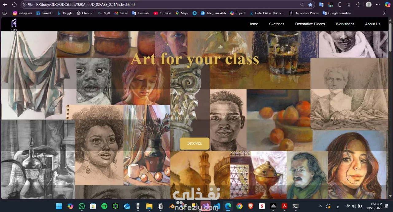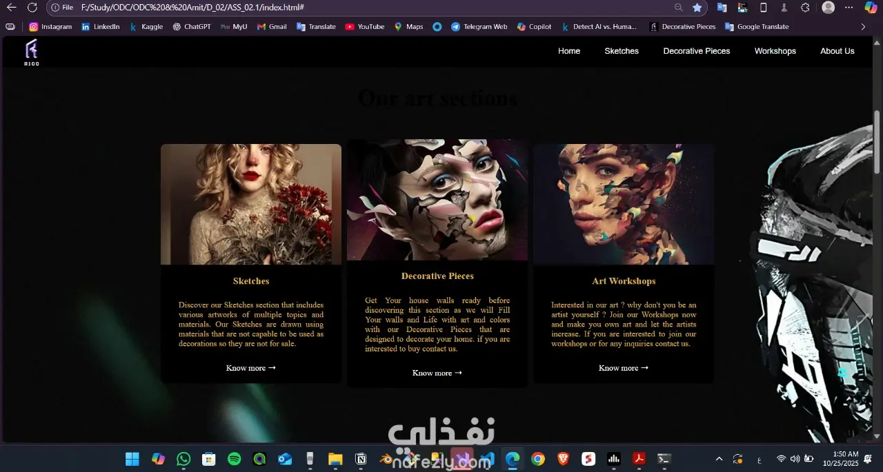موقع ويب يعرض مجموعة متنوعة من الأعمال الفنية اليدوية من رسم وباستيل وفحم وألوان زيتية بطريقة جذابة وتفاعلية. صُمم الموقع باستخدام HTML، CSS، وJavaScript، ويحتوي على واجهة مستخدم مميزة تدمج بين الفن الكلاسيكي والحداثة في العرض، مما يجعله مثاليًا لعرض الأعمال الفنية للطلاب والفنانين.