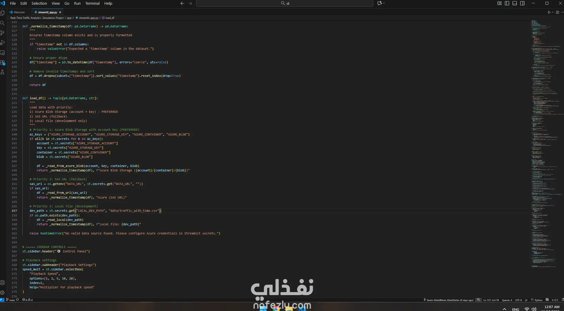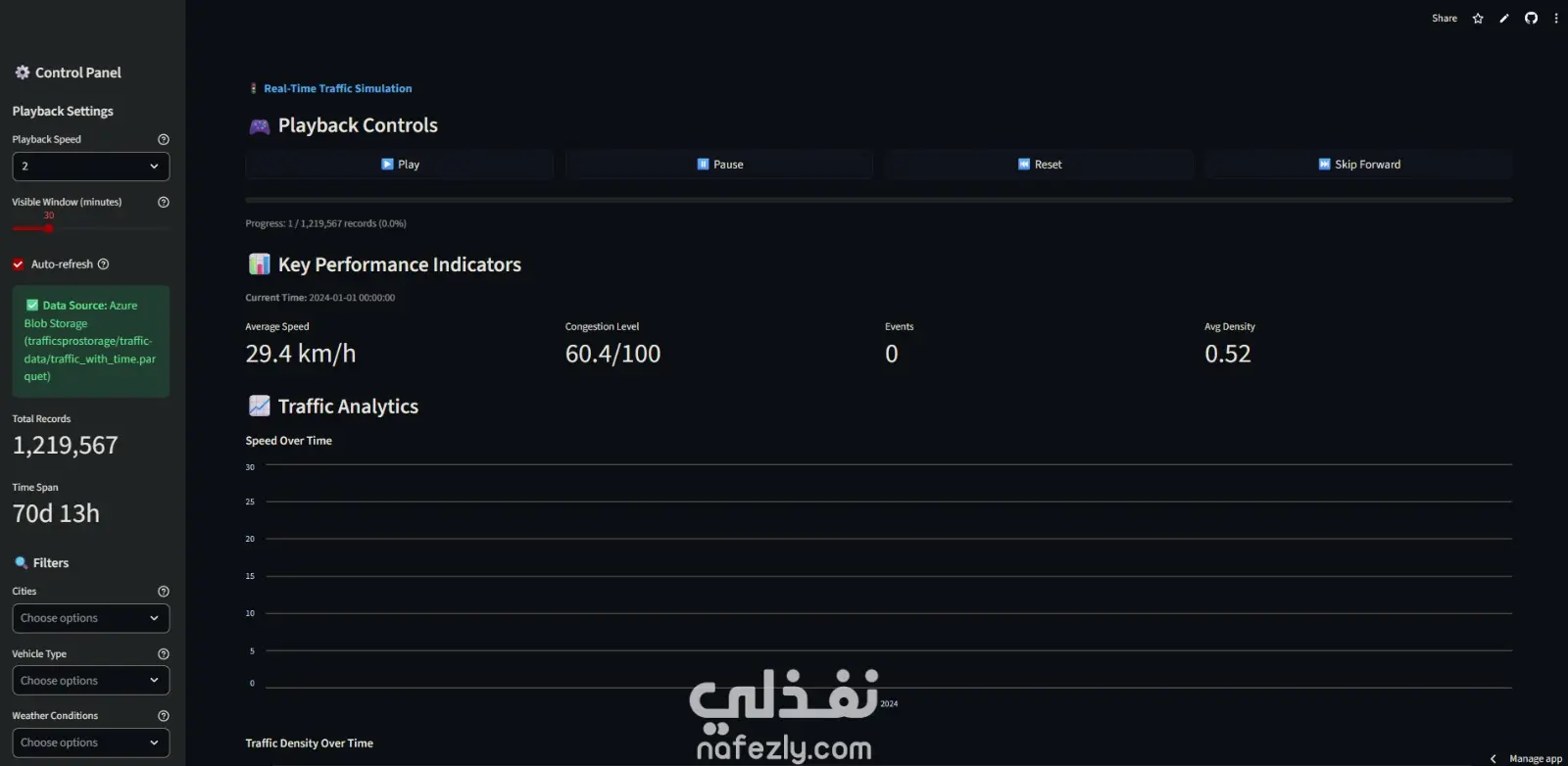 مشروع متكامل لتحليل حركة المرور في الوقت الفعلي باستخدام تقنيات البيانات الضخمة والذكاء الاصطناعي. يقوم النظام بجمع بيانات المركبات من مصادر متعددة، مثل الكاميرات وأجهزة الاستشعار وملفات البيانات، ثم معالجتها باستخدام بايثون وApache Kafka وSpark، وتخزينها في Azure Data Lake.