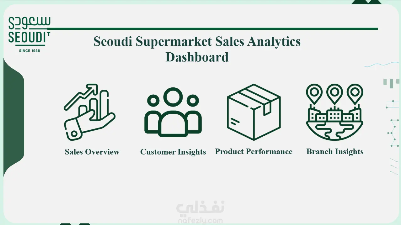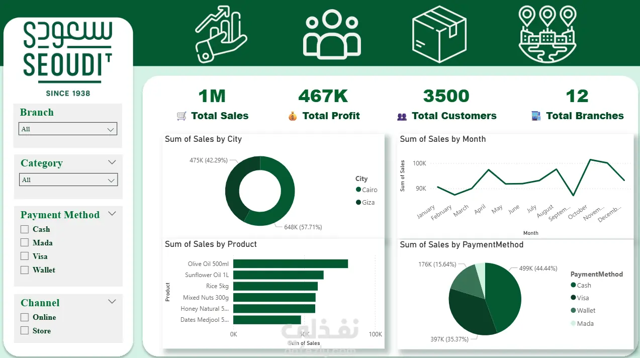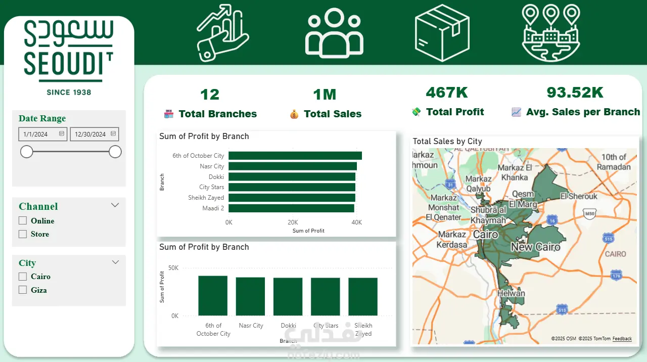 تم تصميم لوحة معلومات تفاعلية باستخدام Power BI لشركة Seoudi Market تُمكّن الإدارة من تتبع الأداء، تحديد الفرص النمو، واتخاذ قرارات مستندة إلى البيانات.