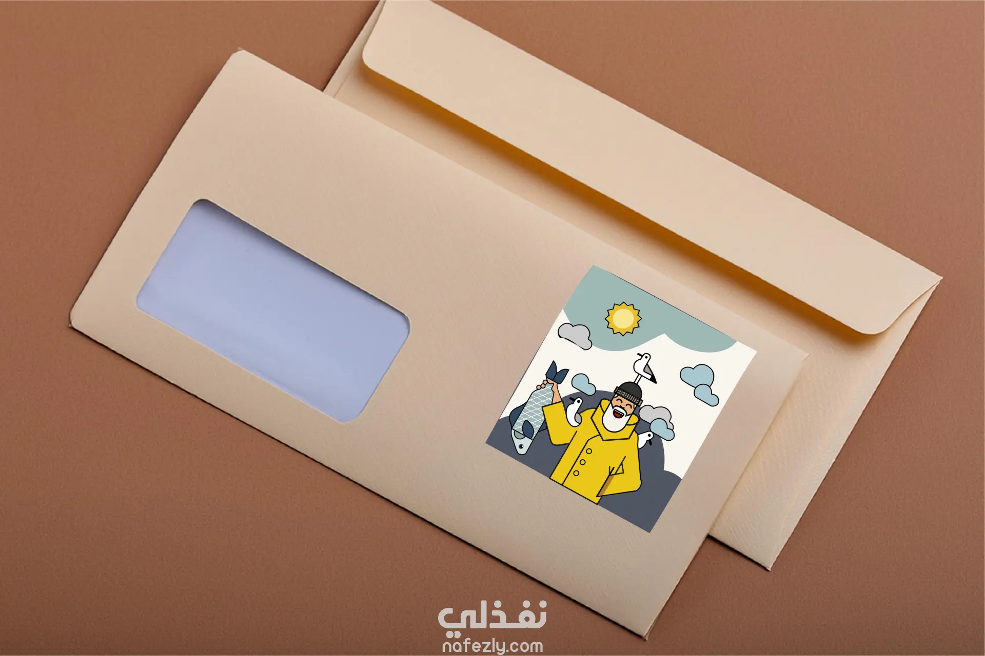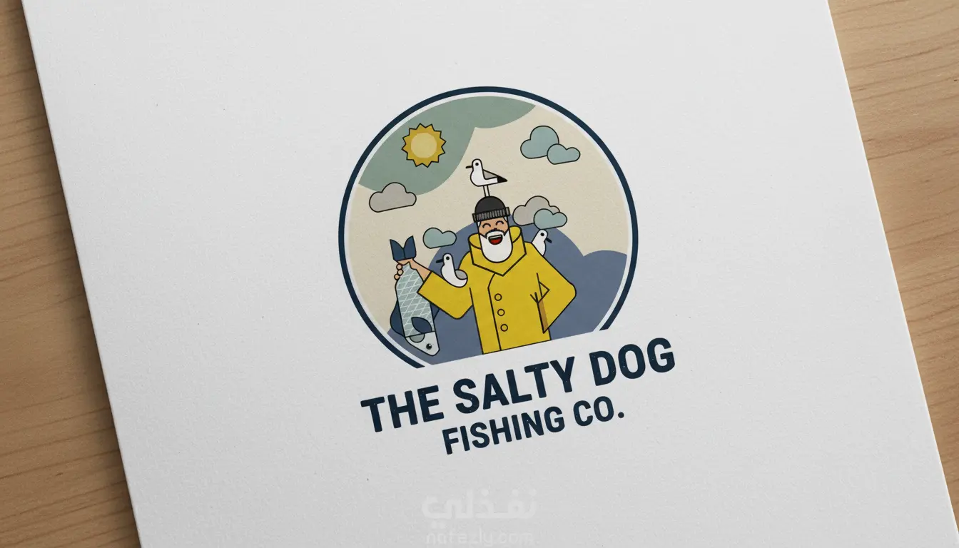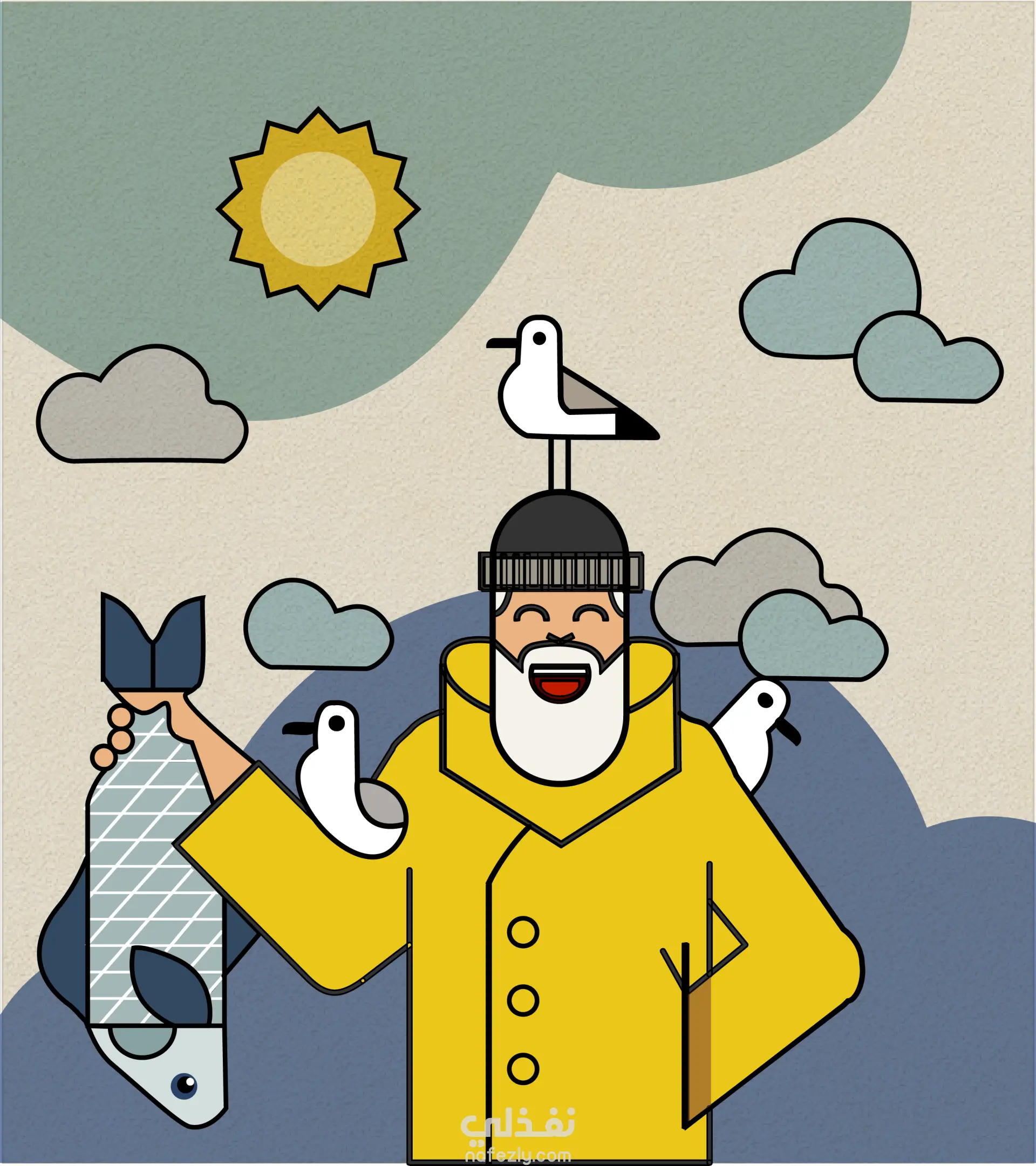 كل عنصر في التصميم مبني من أشكال هندسية بسيطة: الصياد: وجهه دائري، لحيته شكل مركب، عيناه خطوط منحنية، والأزرار على معطفه دوائر مثالية. الشمس: دائرة صفراء مع مثلثات كأشعة. الغيوم: أشكال مستطيلة مستديرة الحواف. السمكة: شكل انسيابي مرسوم بنمط هندسي (خطوط متقاطعة) على جسمها. - تم تحديد كل شكل في التصميم (باستثناء الخلفية) بخط أسود "Stroke". - لا توجد أي تدرجات لونية (gradients). الألوان المستخدمة صلبة ومسطحة (الأصفر الزاهي، الأبيض، درجات الأزرق الرمادي، الأسود). - الخلفية (السماء) وبعض الغيوم تحتوي على ملمس "ورق" (Paper texture) خفيف جداً.