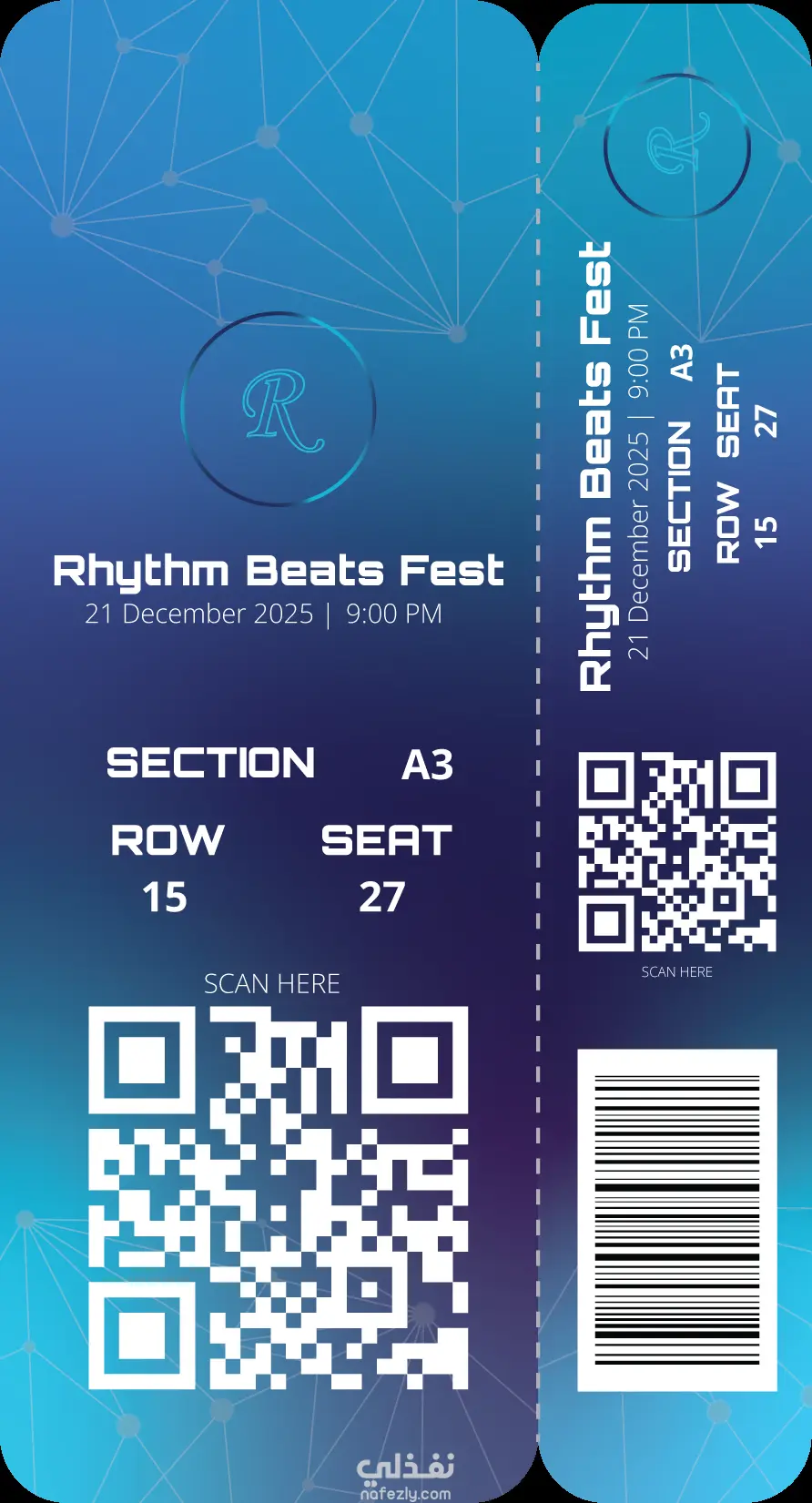 - تم تصميم شعار "R" بسيط ومخصص ليكون العلامة التجارية المركزية للمهرجان، ويظهر كعنصر رئيسي وببراعة على كعب التذكرة.