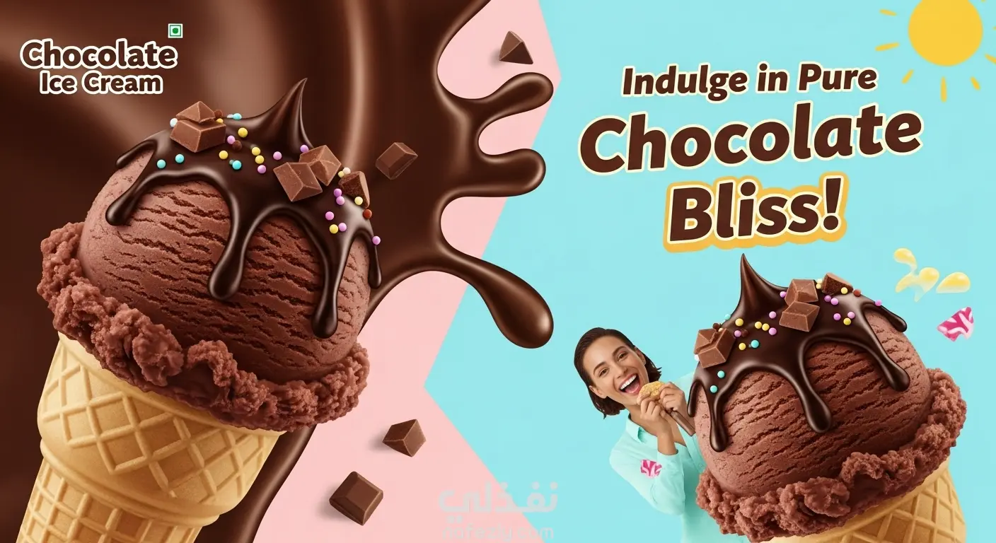 تصميم إعلان سوشيال ميديا جذاب وملون لمنتج الآيس كريم، يشمل: إبراز الآيس كريم بطريقة شهية وواقعية (كوب، مخروط، أو مغرفة). استخدام ألوان زاهية ومرحة تعكس البرودة والحلاوة (وردي، أزرق، أبيض). إضافة تأثيرات مثل قطرات الذوبان أو تزيين الشوكولاتة والفواكه لإظهار الطعم الشهي. إعداد التصميم بصيغة مناسبة للمنشورات على فيسبوك وإنستجرام (1080×1080 بكسل).