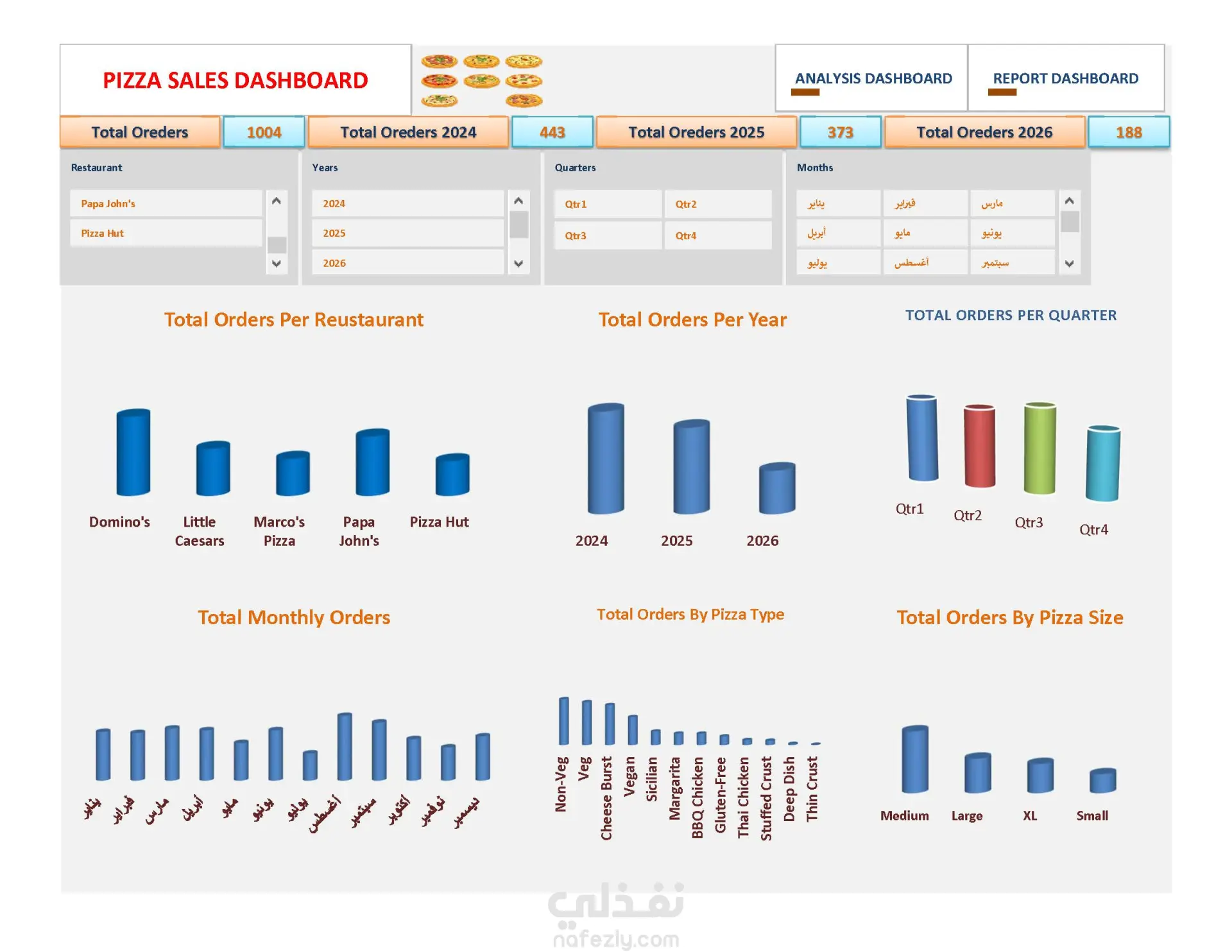 تحليل خاص بمبيعات البيتزا من حيث افضل نوع بيتزا حقق مبيعات وما هو اكثر مطعم حقق مبيعات من افضل نوع بيتزا وما هو افضل مطعم يعمل فى ساعات الذروة وخدمات التوصيل الاسرع ومقارنه المطاعم ببعضها من حيث المبيعات وتحقيق افضل خدمة