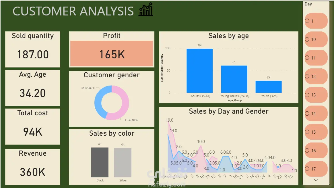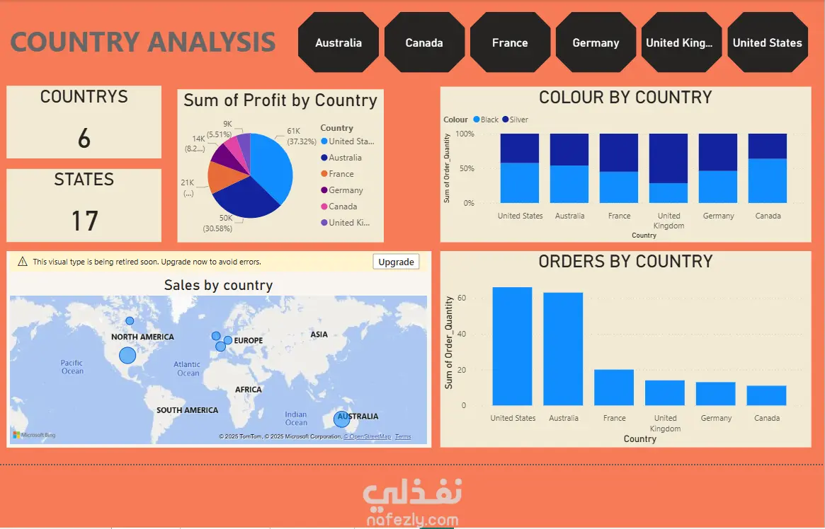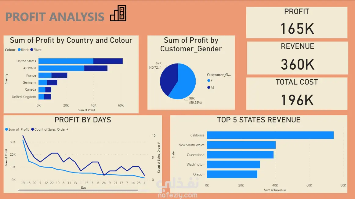 حليل مبيعات متجر دراجات باستخدام power bi في البداية تم عمل تنظيف للبيانات وتهيئتها باستخدام ال power query تم عمل ثلاث تقارير الاول تحليل لنوع المشتريون من حيث الفئة العمرية و النوع ذكر كان او انثي وهكذا الثاني من حيث الدول حيث اظهر التحليل اي الدول اكثر في الاستهلاك وايها اضعف. الثالث تحليل المبيعات بشكل عام تم حساب اجمالي التكلفة والمبيعات والارباح وتوزيع الربح خلال الايام