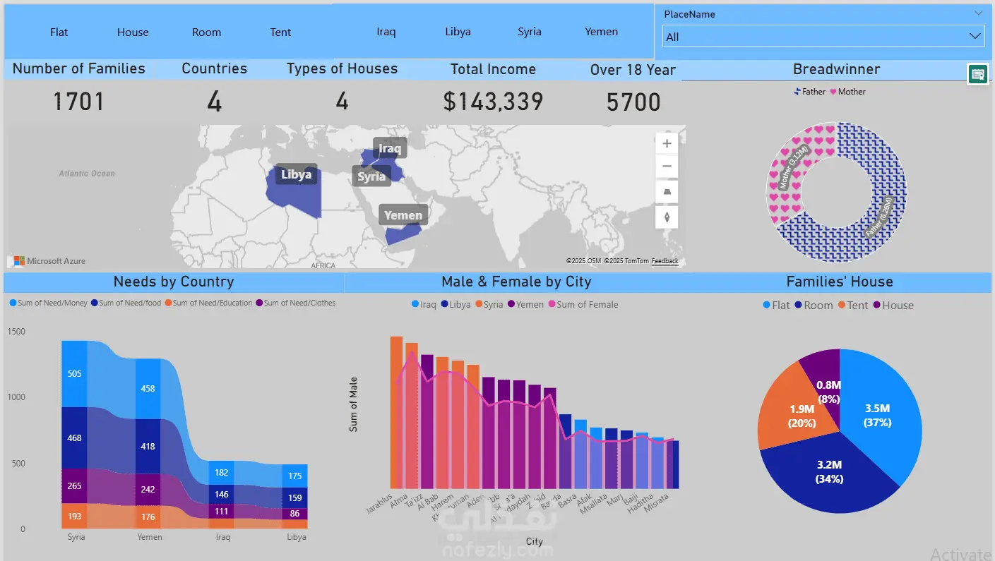 - عدد العائلات المغاثة. - عدد العائلات التي تحتاج الي (مال, تعليم , طعام , ملابس )