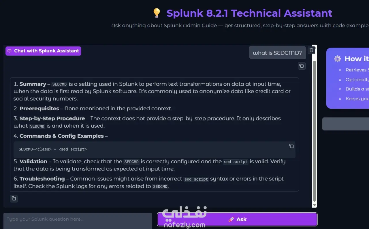 عمل شات بوت يعمل بالذكاء الاصطناعي و النماذج اللغوية الكبيرة لمساعدة المختصين في splunk للاجابة عن كل ما يتعلق به من مشاكل او اي اشياء اخري. تكون الاجابة فقط من Splunk Admin enterprise documentation لضمان جودة و صحة الرد.