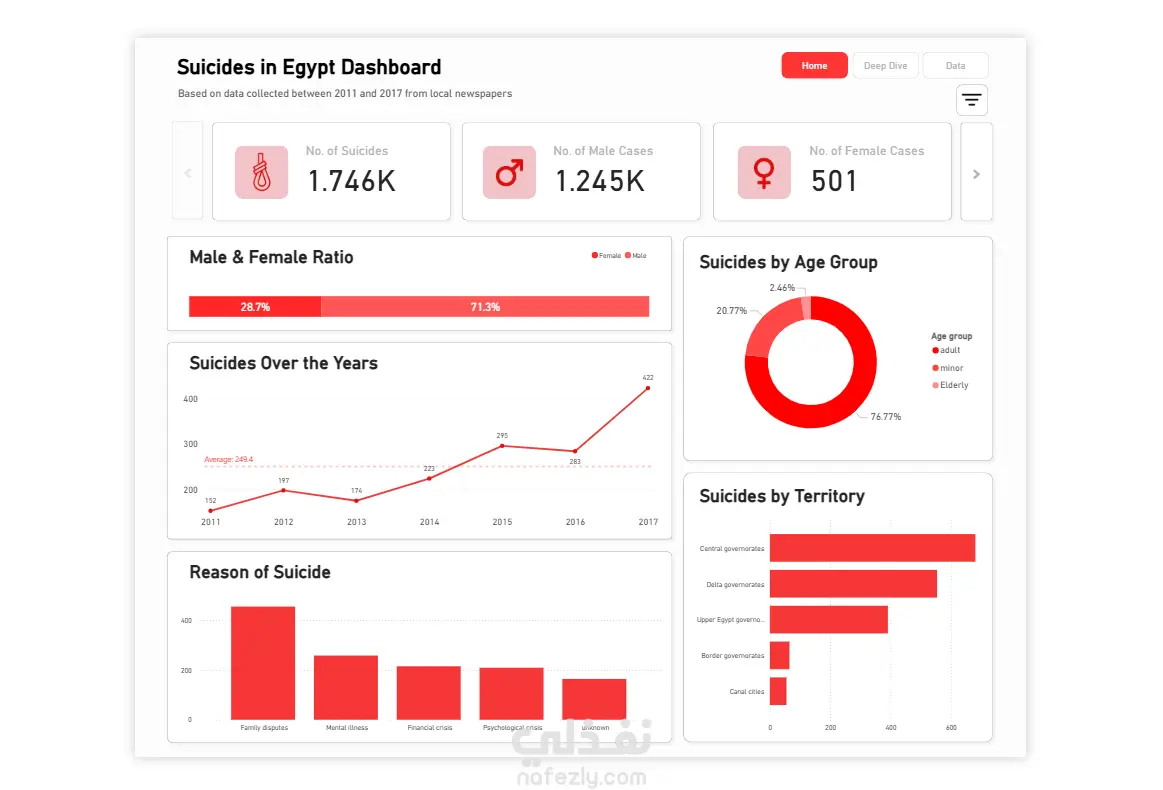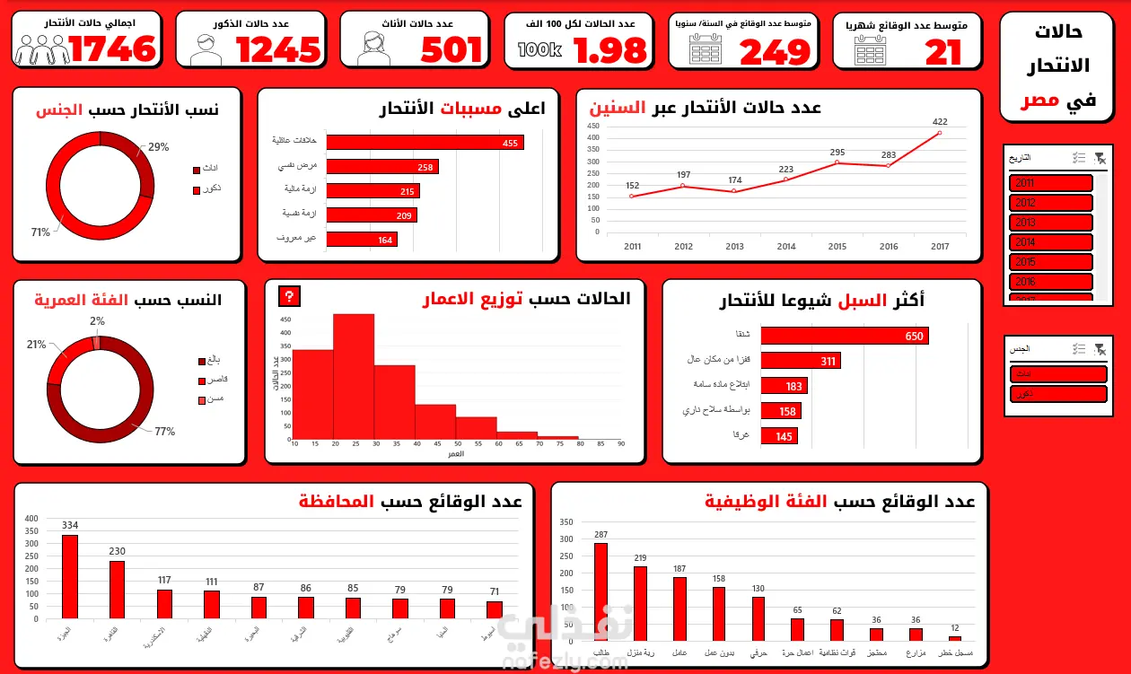 لوحة معلومات Power BI / Excel شاملة بتحليل بيانات دورة كاملة وتقارير تفاعلية عن اتجاهات الانتحار في مصر (2011-2017)