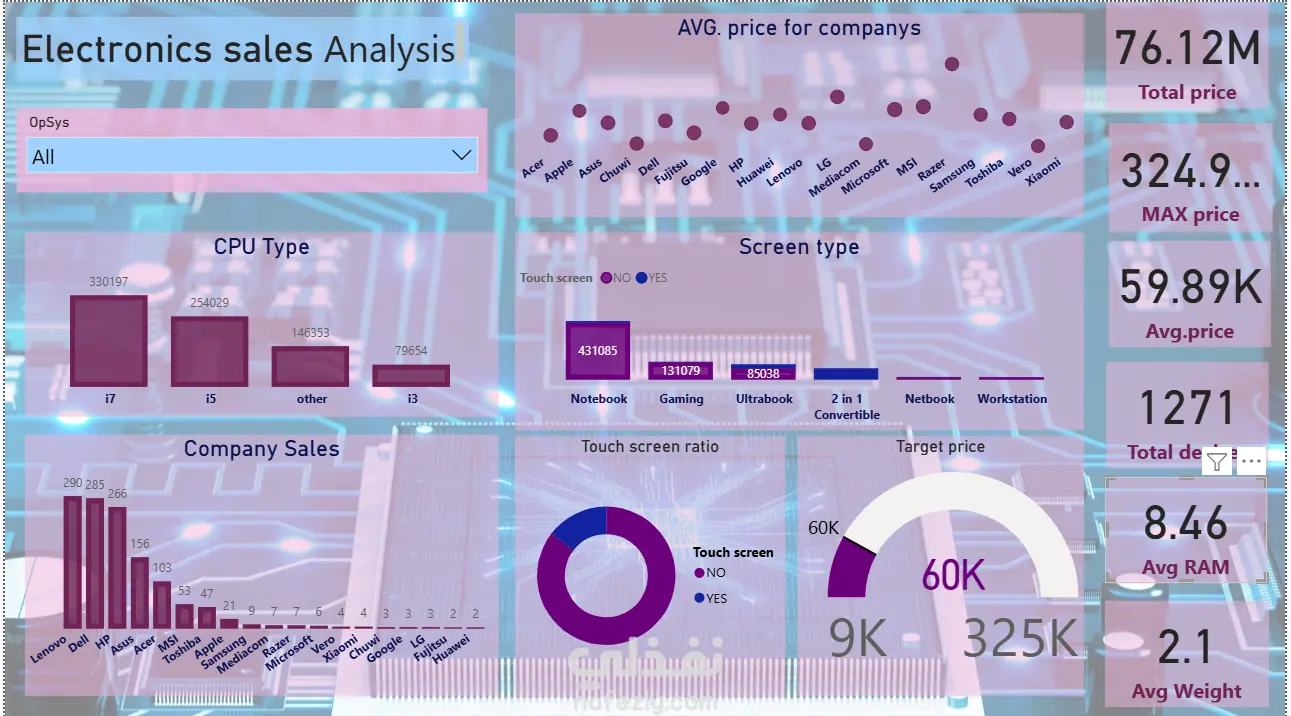 تعرض أهم المؤشرات مثل إجمالي المبيعات، متوسط الأسعار، أداء الشركات، أنواع المعالجات والشاشات، ونسبة الأجهزة المزودة بشاشات لمس.