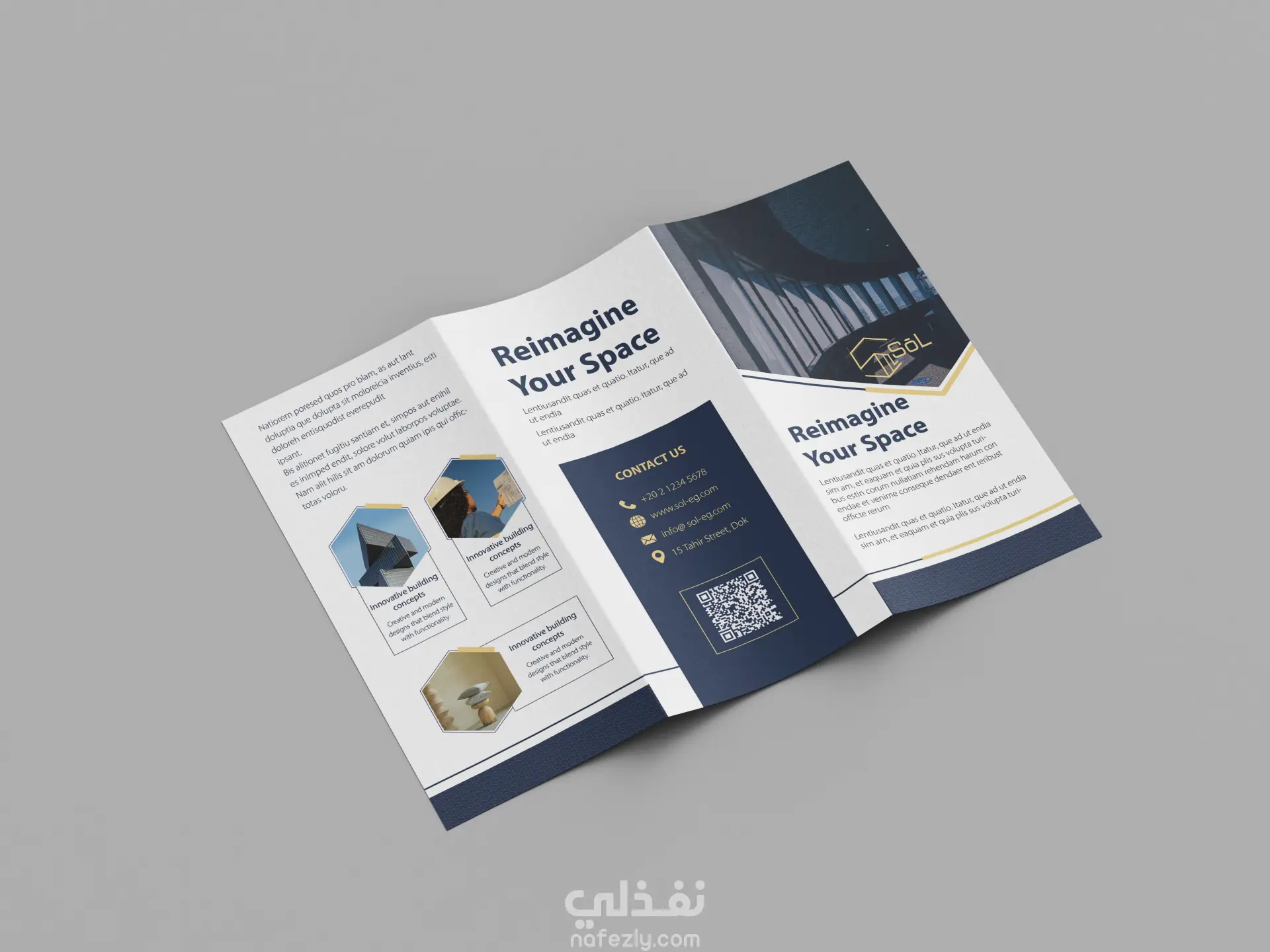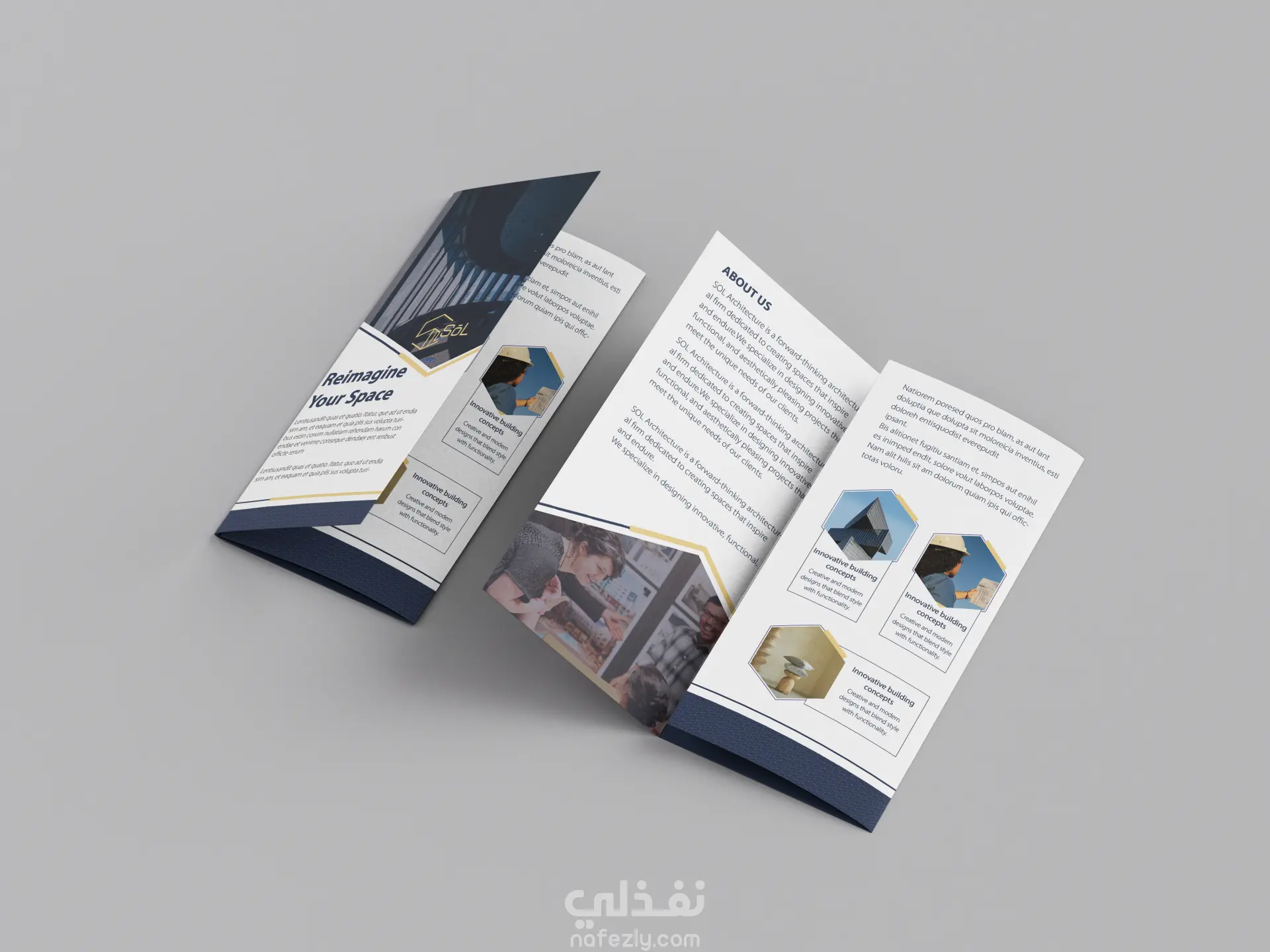 تم استخدام صور هندسية وخطوط واضحة لإبراز الطابع المعماري، وتنظيم المعلومات بشكل يسهل قراءته ويعطي انطباعًا قويًا عن خدمات الشركة.
