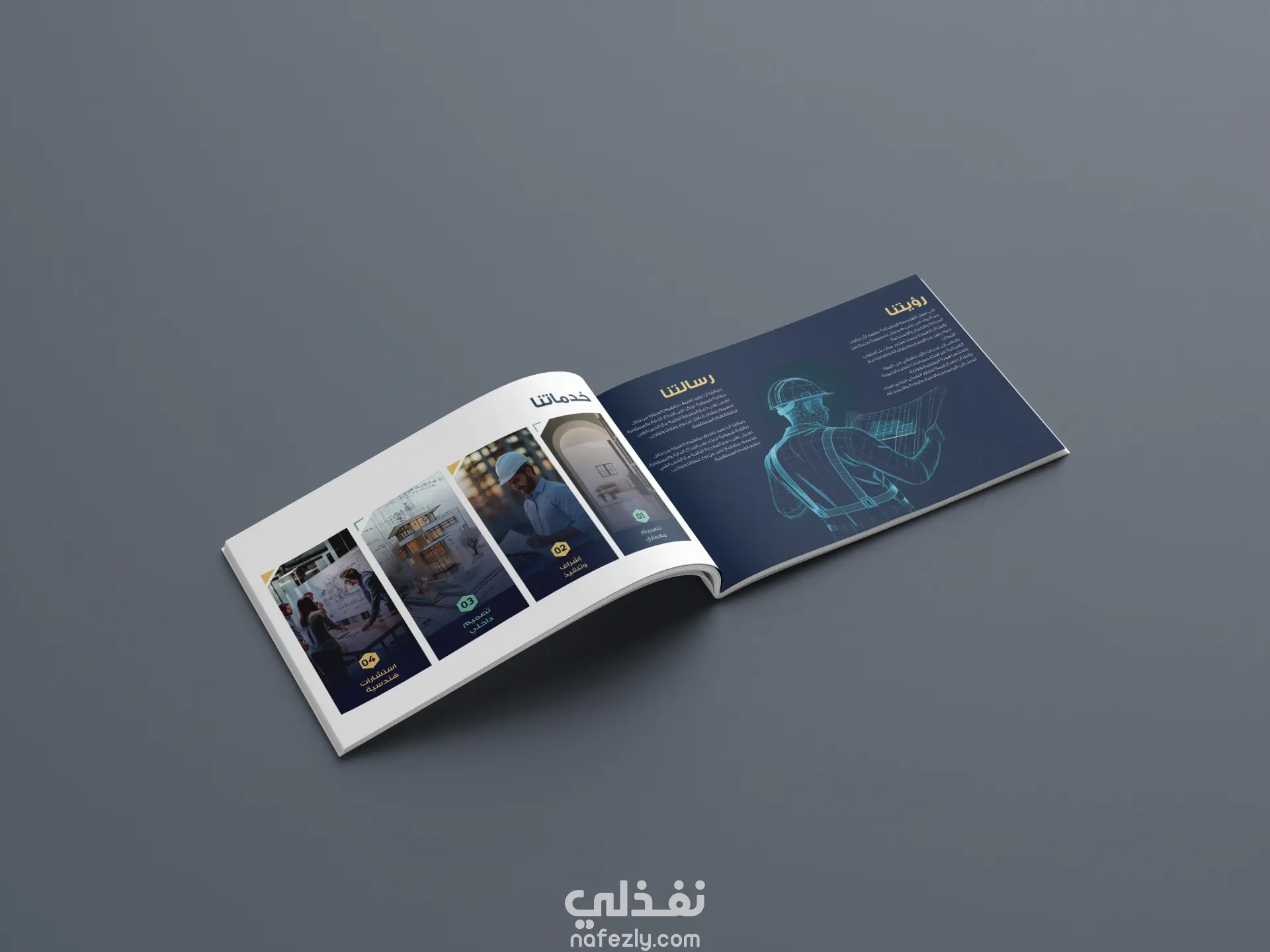 يعرض البروفايل رؤية الشركة، خدماتها، قيمها الأساسية، وفريق العمل، ضمن تنسيق بصري منظم يجمع بين الألوان الراقية والخطوط الواضحة والعناصر المعمارية المستوحاة من هوية العلامة.