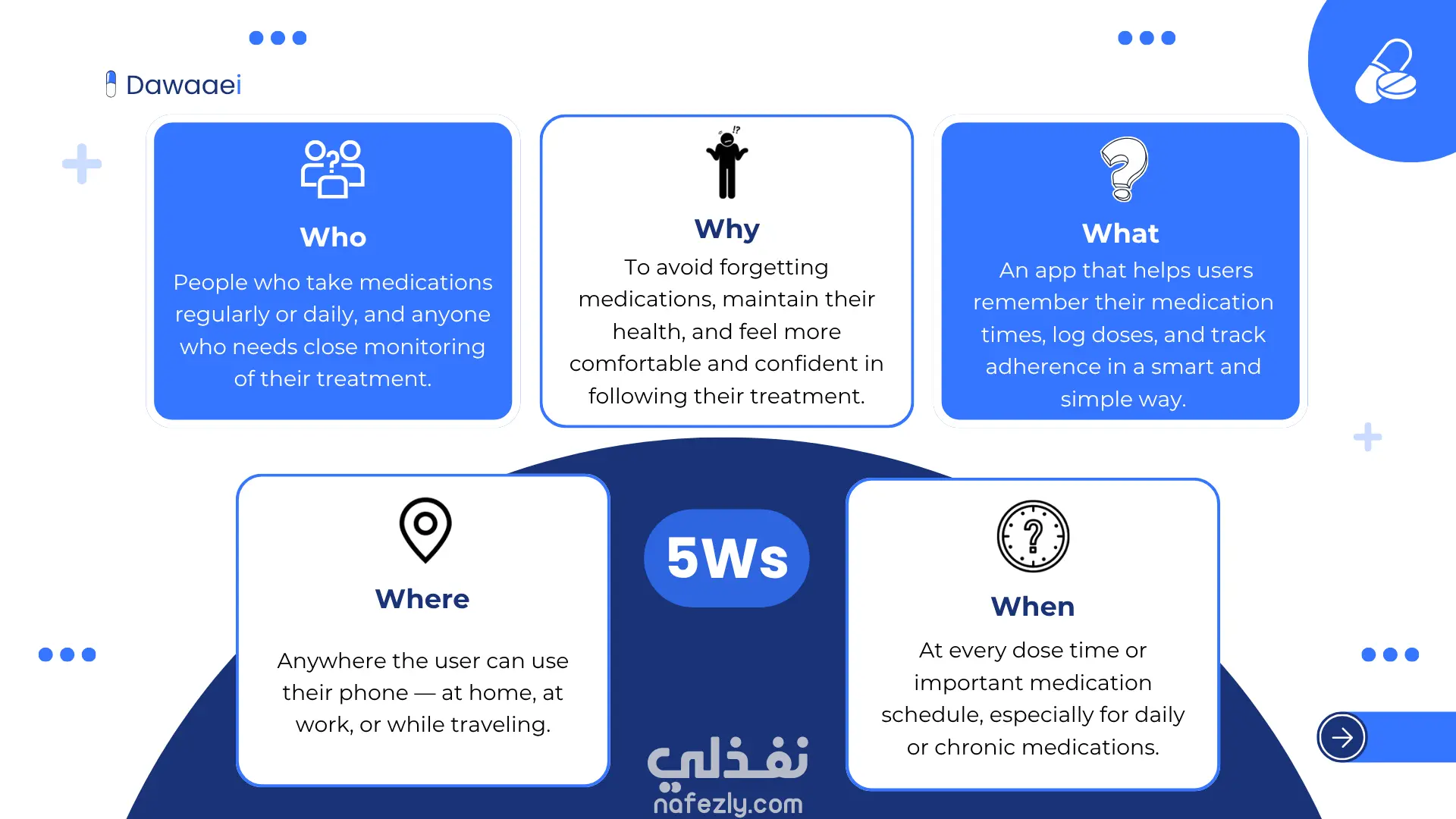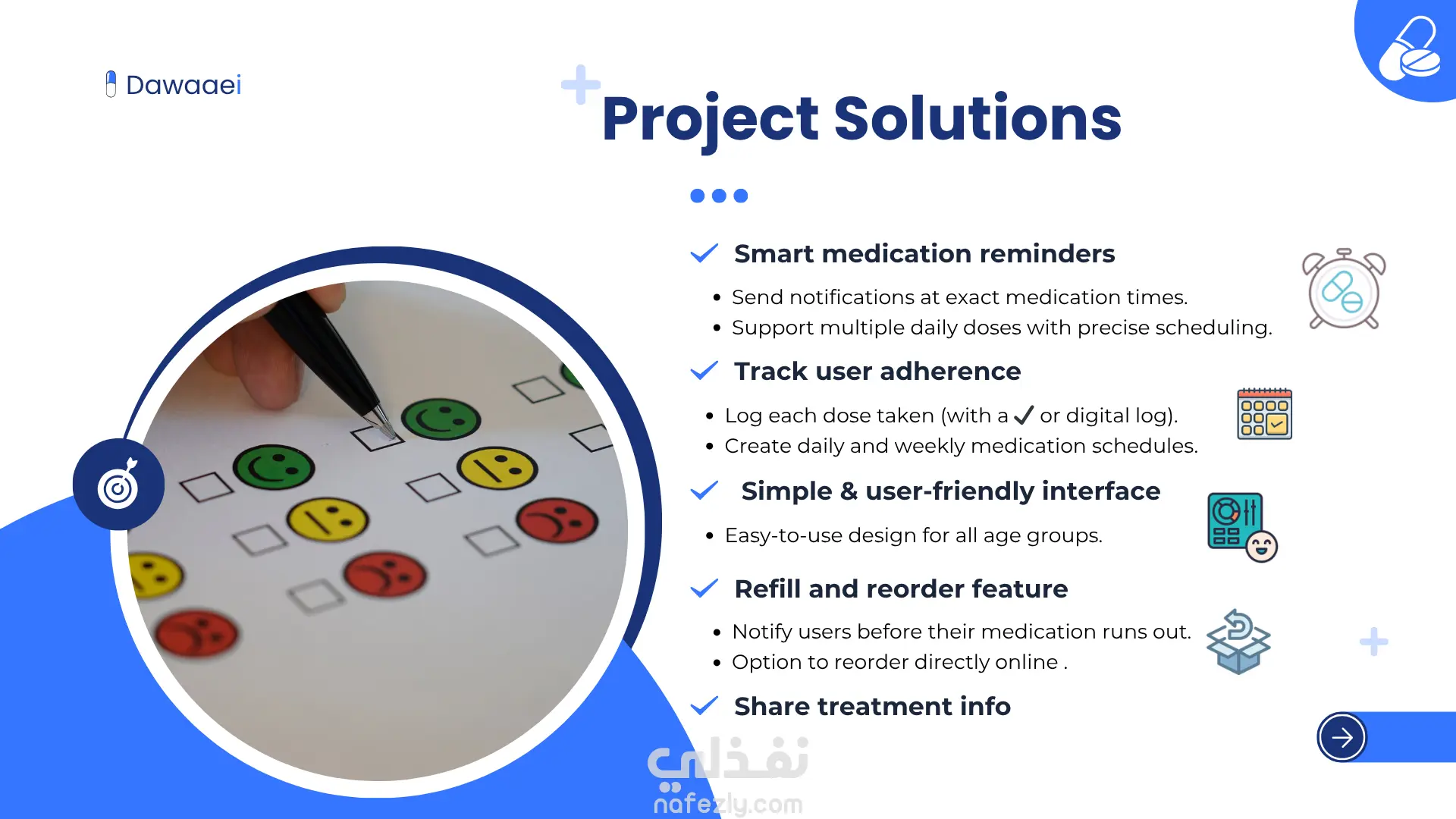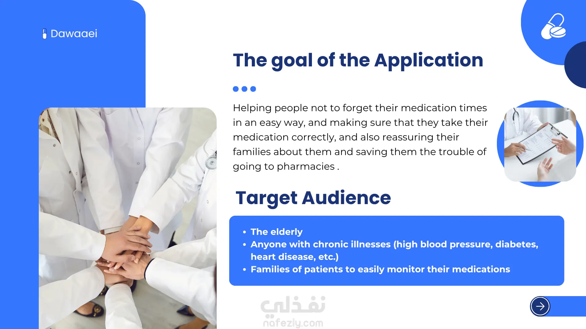 تطبيق Dawaaei App يساعد المستخدمين، وخاصة كبار السن، على تذكّر مواعيد أدويتهم، متابعة الجرعات بدقة، الاطمئنان على صحتهم، ومشاركة المعلومات مع العائلة. كما يتيح إعادة طلب الأدوية من أقرب صيدلية بسهولة. يتميز التطبيق بواجهة استخدام بسيطة، تذكيرات ذكية، تسجيل الجرعات، ودعم عدة جرعات يومية لضمان الالتزام بالعلاج وتقليل القلق لدى العائلات.