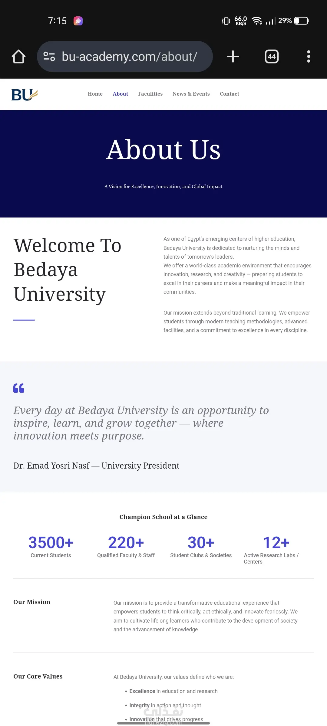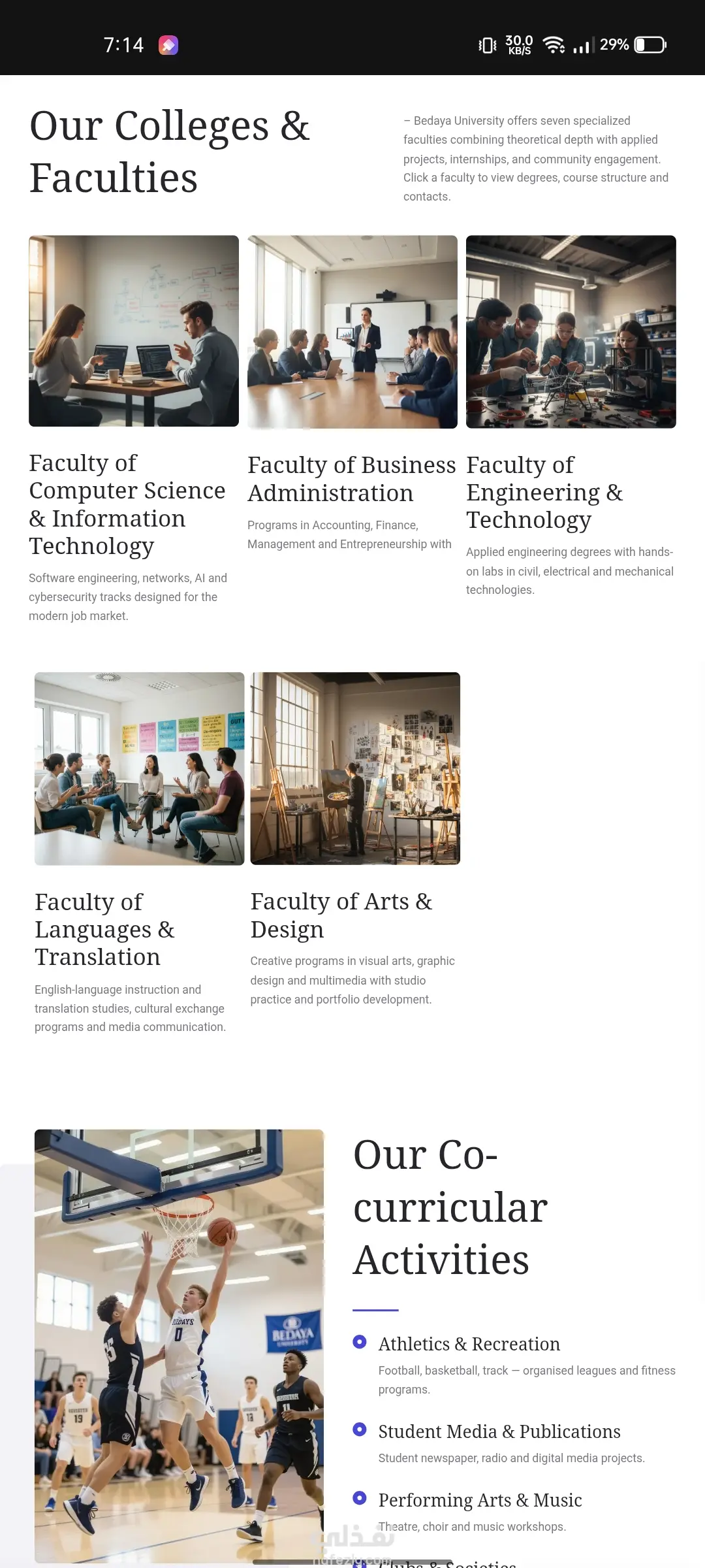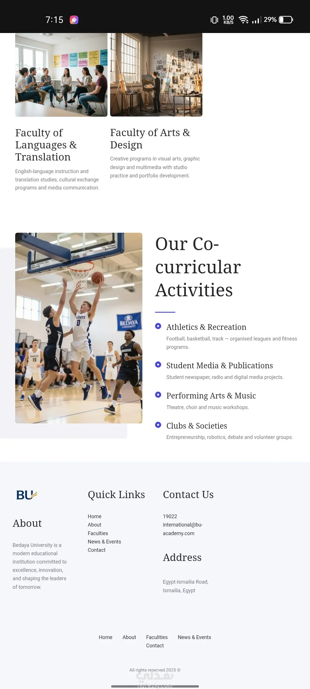 تصميم وتطوير موقع إلكتروني تعريفي احترافي لجامعة خاصة (Bedaya University) باستخدام ووردبريس. الهدف من المشروع: إنشاء منصة رقمية رسمية وجذابة لجامعة "بداية" (Bedaya University) تعكس رؤيتها الأكاديمية القائمة على التعليم العملي والتأثير المجتمعي. كان الهدف هو توفير موقع سهل التصفح، يعرض الكليات والبرامج الأكاديمية والأنشطة الطلابية بطريقة منظمة واحترافية. المهام والنتائج الرئيسية التي تم تحقيقها: 1.تأسيس البنية التحتية: •تنصيب وتهيئة نظام ووردبريس كنظام إدارة محتوى قوي وموثوق. •اختيار وتخصيص قالب احترافي يتناسب مع الهوية البصرية للمؤسسات التعليمية الكبرى. 2.التصميم وتجربة المستخدم (UX/UI): •تطبيق تصميم نظيف، حديث، ومستجيب (Responsive) يضمن أفضل تجربة تصفح على جميع الأجهزة (سطح المكتب، الهاتف المحمول). •إنشاء هيكل صفحات واضح يشمل: الرئيسية، عن الجامعة، الكليات، الأخبار والفعاليات، واتصل بنا. 3.هيكلة المحتوى الأكاديمي: •تصميم صفحات مخصصة لعرض الكليات المتخصصة (مثل علوم الحاسوب، إدارة الأعمال، الهندسة، اللغات) مع إمكانية إضافة تفاصيل الدرجات والمسارات لكل كلية. •تنظيم وعرض الأنشطة المشتركة (Co-curricular Activities) مثل الألعاب الرياضية، الإعلام الطلابي، والنوادي والجمعيات. 4.عناصر بناء الثقة والاحترافية: •تضمين قسم خاص لإحصائيات الجامعة (الطلاب الحاليين، أعضاء هيئة التدريس، الأندية) لتعزيز المصداقية. •إعداد الموقع لدعم المحتوى باللغة الإنجليزية، بما يتناسب مع طبيعة الجامعة. التقنيات المستخدمة: •نظام إدارة المحتوى (CMS): ووردبريس (WordPress) •التصميم: (يمكنك إضافة اسم القالب أو الباني الذي استخدمته، مثل Elementor, Divi, Astra)