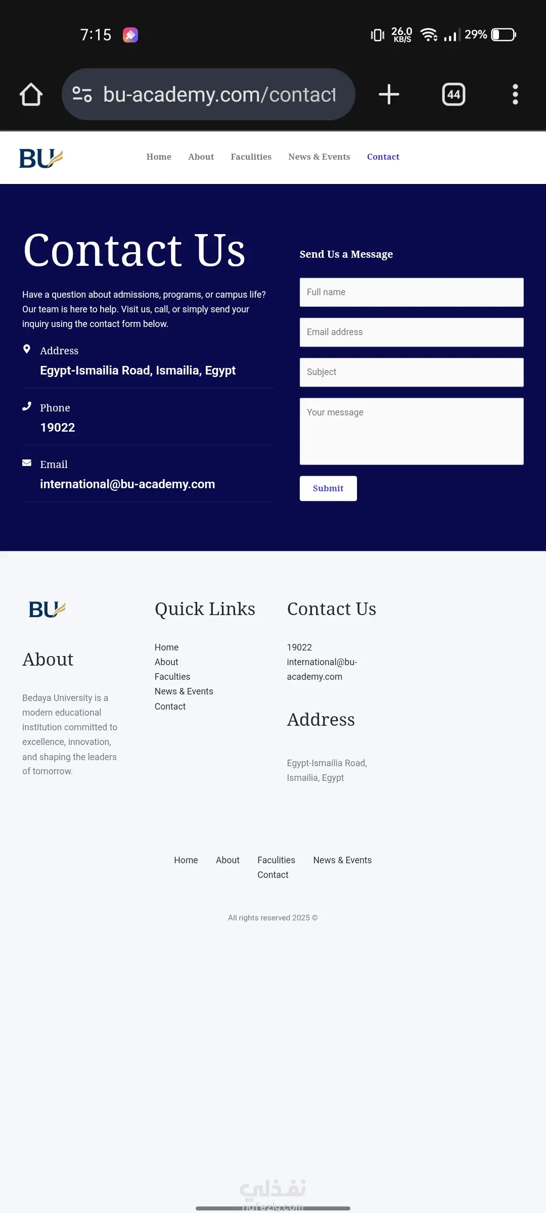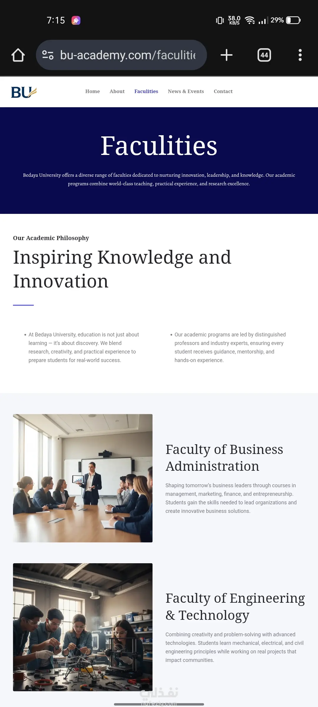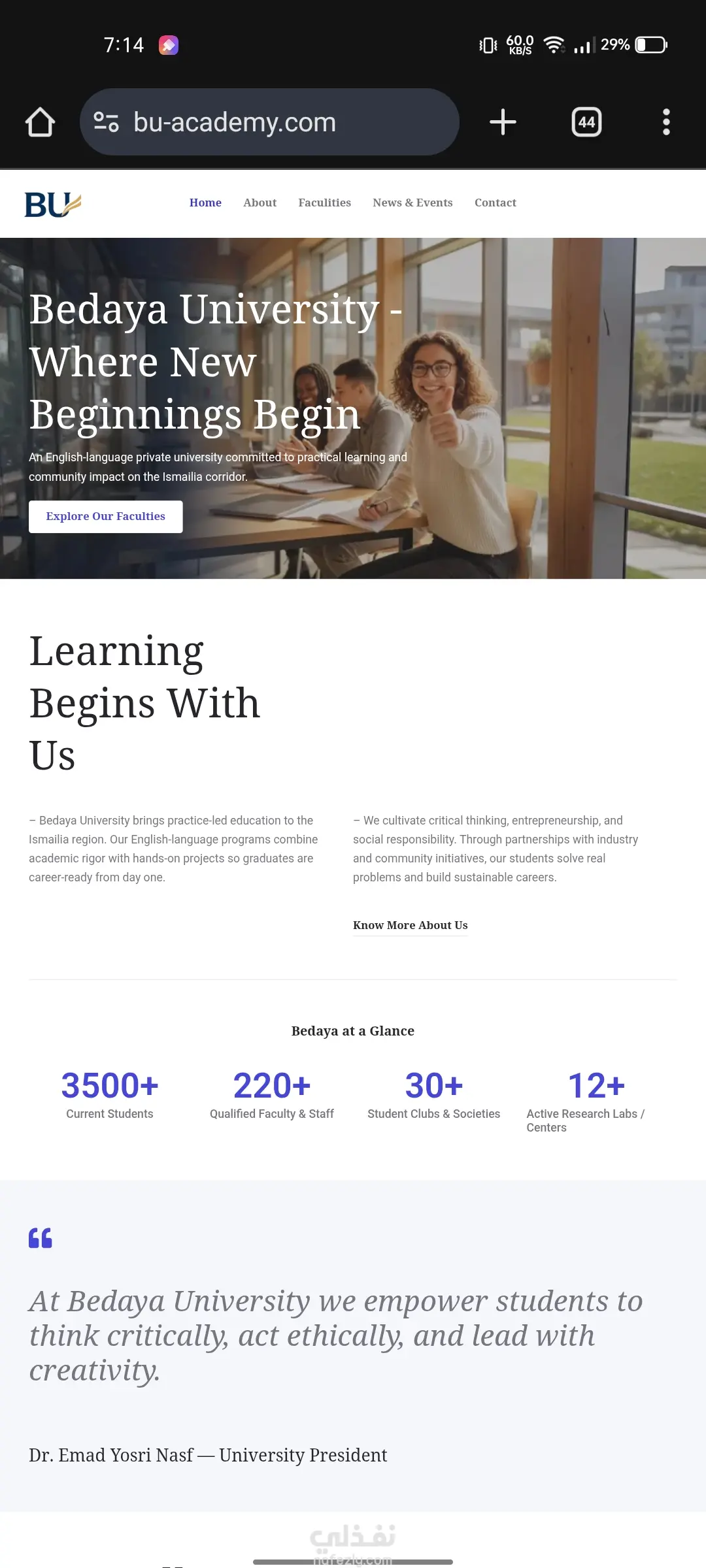 تصميم وتطوير موقع إلكتروني تعريفي احترافي لجامعة خاصة (Bedaya University) باستخدام ووردبريس. الهدف من المشروع: إنشاء منصة رقمية رسمية وجذابة لجامعة "بداية" (Bedaya University) تعكس رؤيتها الأكاديمية القائمة على التعليم العملي والتأثير المجتمعي. كان الهدف هو توفير موقع سهل التصفح، يعرض الكليات والبرامج الأكاديمية والأنشطة الطلابية بطريقة منظمة واحترافية. المهام والنتائج الرئيسية التي تم تحقيقها: 1.تأسيس البنية التحتية: •تنصيب وتهيئة نظام ووردبريس كنظام إدارة محتوى قوي وموثوق. •اختيار وتخصيص قالب احترافي يتناسب مع الهوية البصرية للمؤسسات التعليمية الكبرى. 2.التصميم وتجربة المستخدم (UX/UI): •تطبيق تصميم نظيف، حديث، ومستجيب (Responsive) يضمن أفضل تجربة تصفح على جميع الأجهزة (سطح المكتب، الهاتف المحمول). •إنشاء هيكل صفحات واضح يشمل: الرئيسية، عن الجامعة، الكليات، الأخبار والفعاليات، واتصل بنا. 3.هيكلة المحتوى الأكاديمي: •تصميم صفحات مخصصة لعرض الكليات المتخصصة (مثل علوم الحاسوب، إدارة الأعمال، الهندسة، اللغات) مع إمكانية إضافة تفاصيل الدرجات والمسارات لكل كلية. •تنظيم وعرض الأنشطة المشتركة (Co-curricular Activities) مثل الألعاب الرياضية، الإعلام الطلابي، والنوادي والجمعيات. 4.عناصر بناء الثقة والاحترافية: •تضمين قسم خاص لإحصائيات الجامعة (الطلاب الحاليين، أعضاء هيئة التدريس، الأندية) لتعزيز المصداقية. •إعداد الموقع لدعم المحتوى باللغة الإنجليزية، بما يتناسب مع طبيعة الجامعة. التقنيات المستخدمة: •نظام إدارة المحتوى (CMS): ووردبريس (WordPress) •التصميم: (يمكنك إضافة اسم القالب أو الباني الذي استخدمته، مثل Elementor, Divi, Astra)