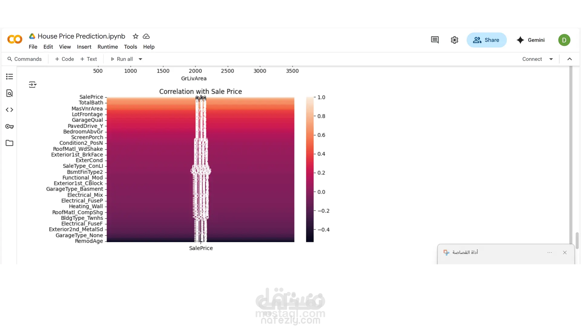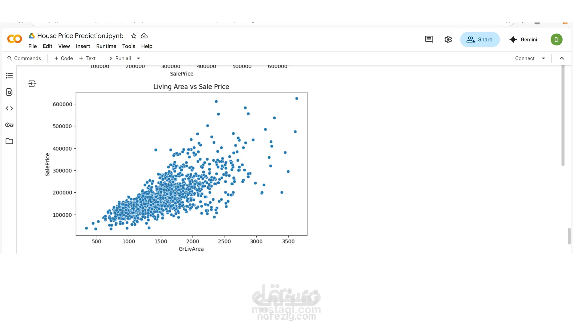 نوع العمل: نموذج تعلم آلة (Machine Learning Model) للتنبؤ بأسعار المنازل. ميزاته: يعتمد على تحليل البيانات الحقيقية. يقدم تنبؤات دقيقة تساعد في اتخاذ قرارات البيع والشراء. يحتوي على رسومات بيانية توضّح العلاقات بين العوامل (مثل مساحة المنزل وعدد الغرف والسعر). طريقة تنفيذه: تم استخدام لغة Python مع مكتبات Pandas, NumPy, Scikit-learn لمعالجة البيانات وتدريب النموذج. مر المشروع بعدة مراحل: تنظيف البيانات، تحليلها، تقسيمها إلى بيانات تدريب واختبار، ثم بناء النموذج واختبار دقته.