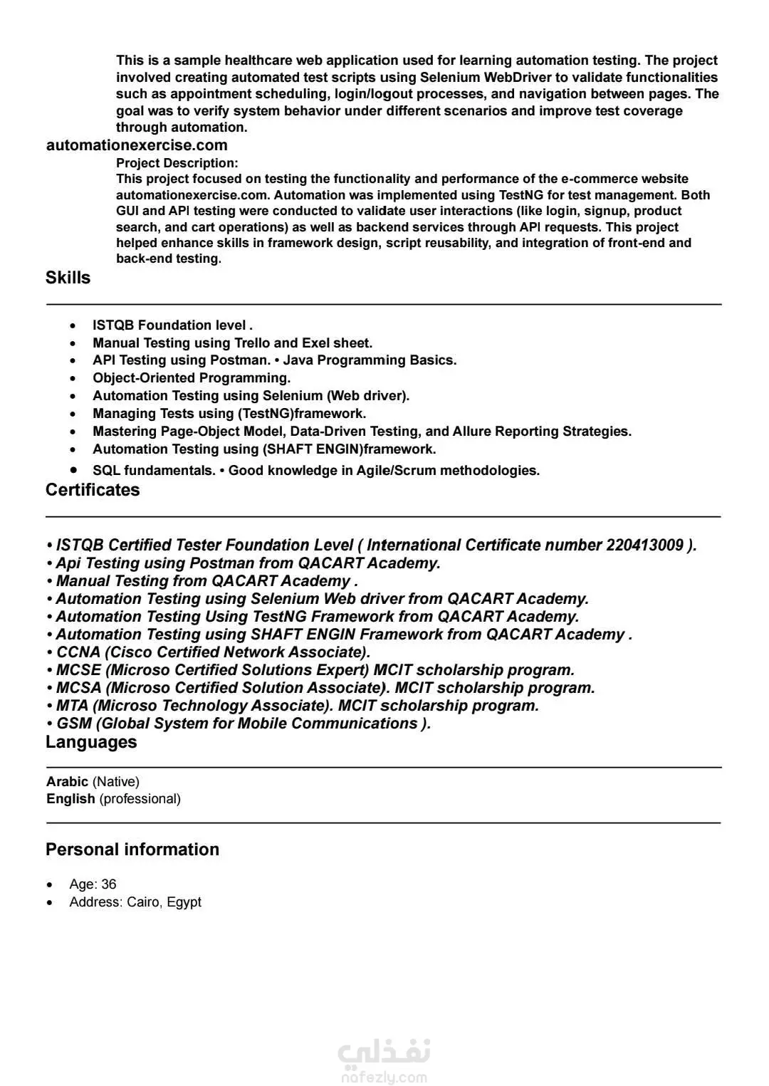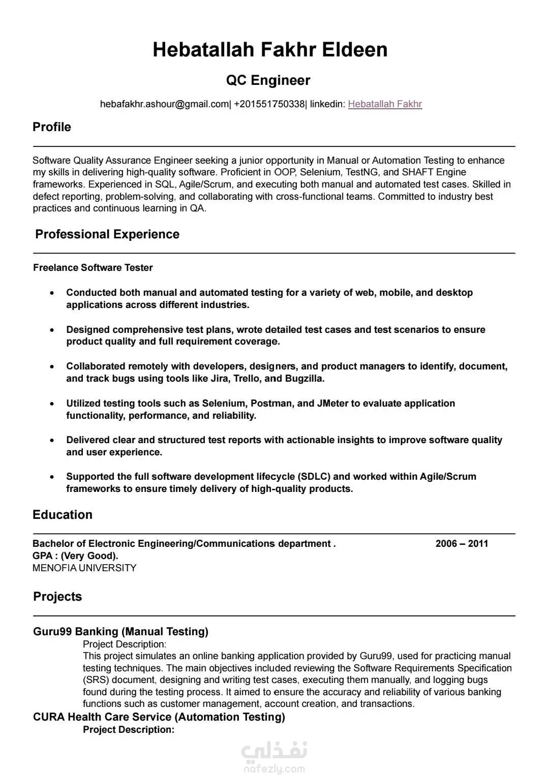 Resume Design & Formatting – QC Engineer Profile A clean, professional two-page resume merged into a single high-quality layout. The design highlights experience in Manual & Automation Testing, including skills in Selenium, TestNG, Postman, Agile/Scrum, and SDLC practices. The document presents a structured profile, professional experience, projects, skills, certifications, and personal information in a clear, ATS-friendly format suitable for QA roles.