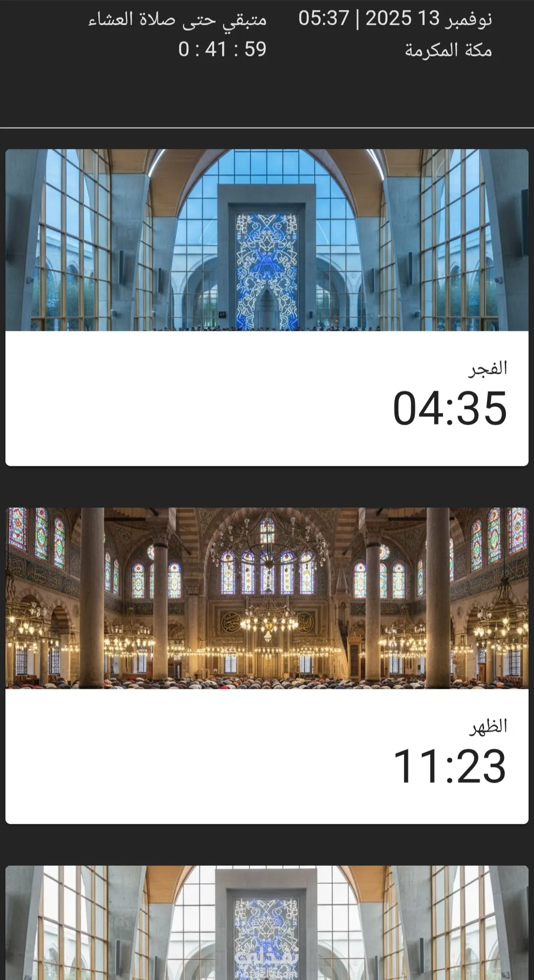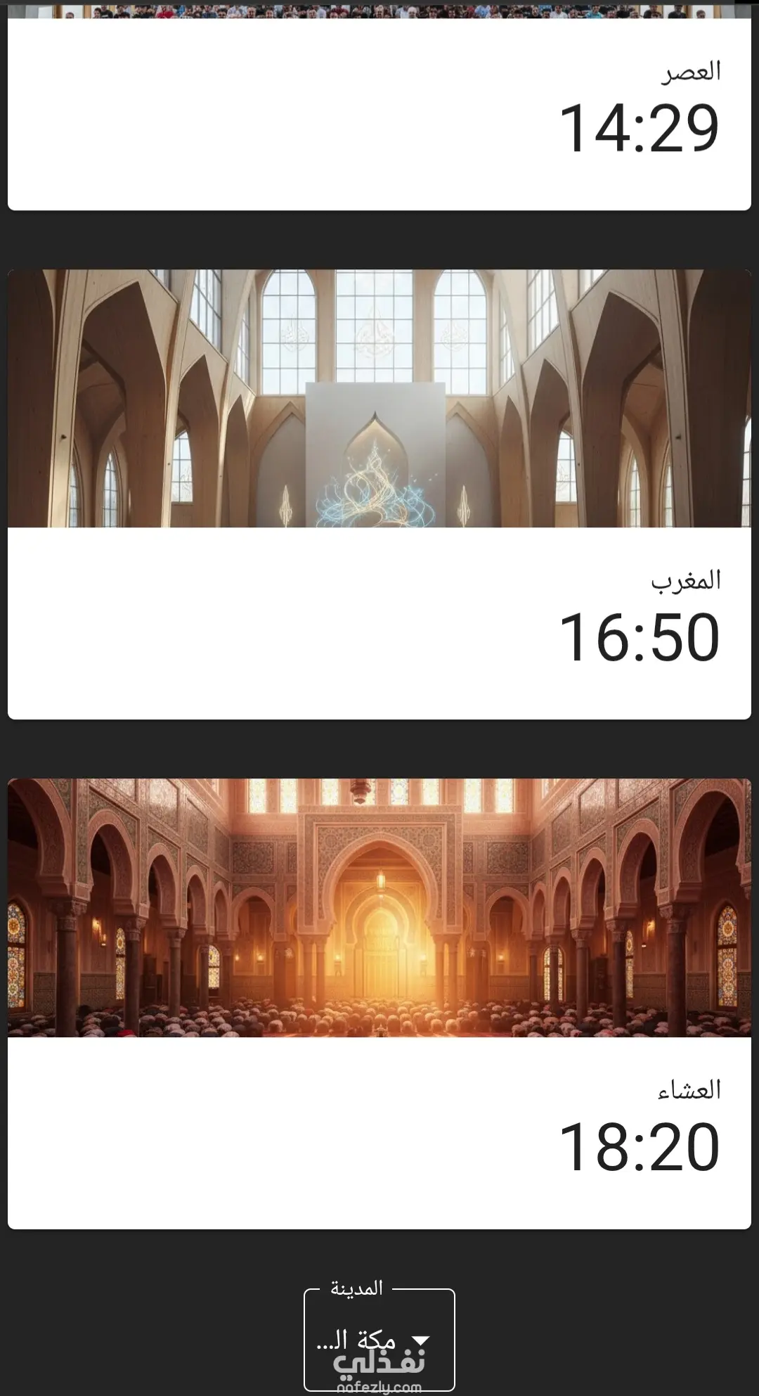 معرفة مواعيد الصلاة حسب المدينة و الوقت المتبقي حتى الصلاة التالية.
