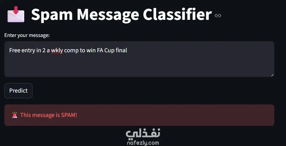 تم حفظ النموذج والمتجه في ملفات .pkl لاستخدامهما لاحقًا في تطبيق Streamlit تفاعلي، يتيح للمستخدم إدخال أي رسالة والحصول على التنبؤ الفوري إذا كانت Spam أو Ham.