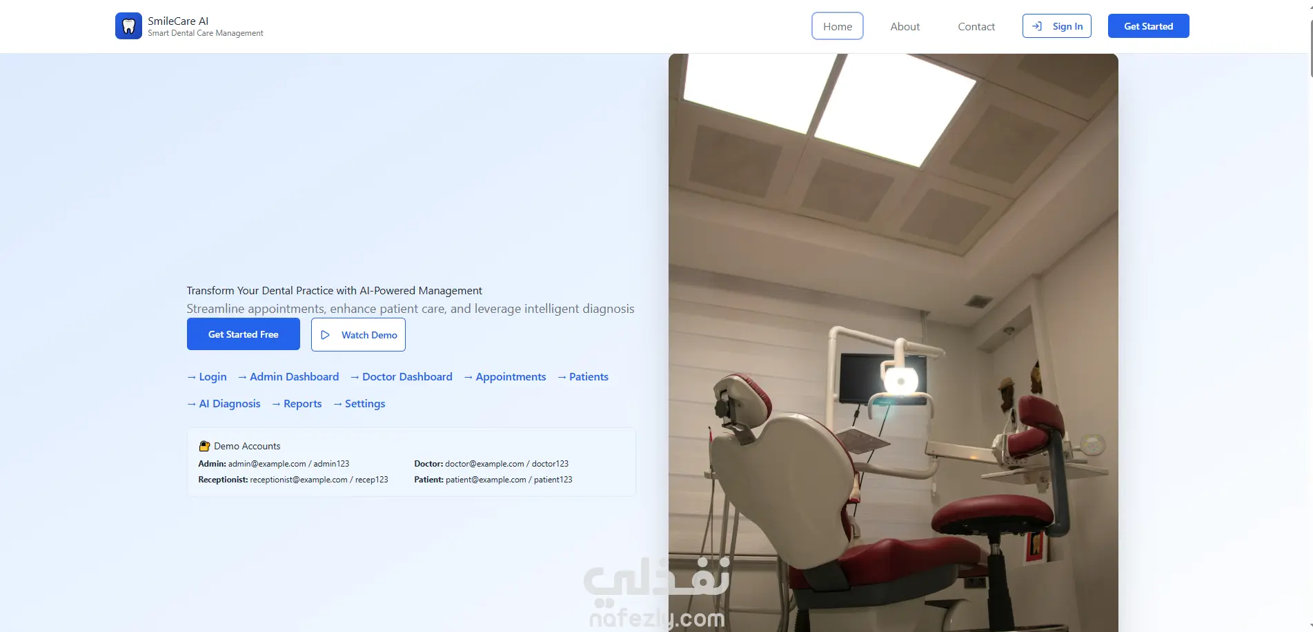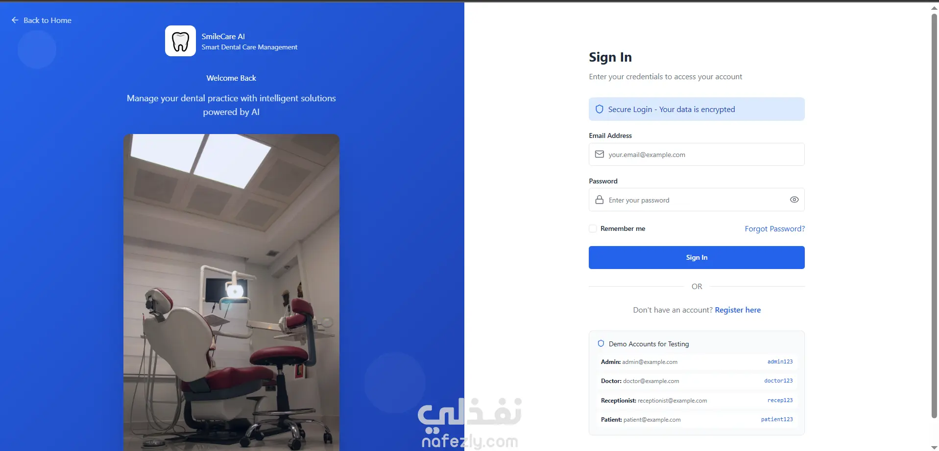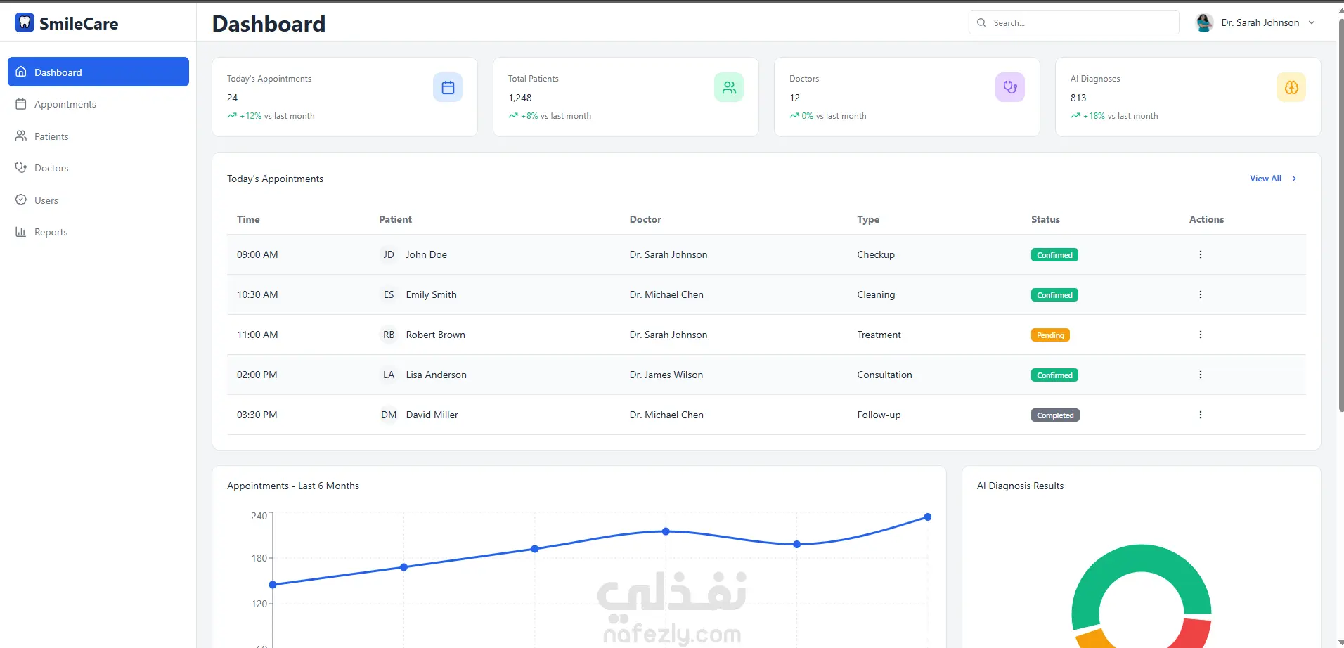Project Description: SmileCare is a full-stack dental clinic management system developed using ASP.NET Core Web API for the backend and Angular for the frontend. The system is designed to streamline clinic operations by managing patients, appointments, and medical records through a secure and intuitive web interface. Key Features Patient management (add, update, soft delete). Appointment scheduling and tracking. Role-based access control (Admin, Doctor, Receptionist, Patient). Secure authentication using JWT tokens. Dashboard with real-time clinic insights. CRUD operations for all core entities. Responsive, clean, and user-friendly Angular interface.