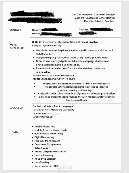 اشتغلت على إعداد وتصميم أكتر من CV بطريقة احترافية بتبرز المهارات والخبرات بشكل منسق وجذاب، ومناسب للتقديم في الشركات أو على منصات التوظيف زي LinkedIn. ركزت إن كل CV يكون بلغة قوية وواضحة، وتصميم بسيط يلفت النظر من غير ما يكون مزدحم.