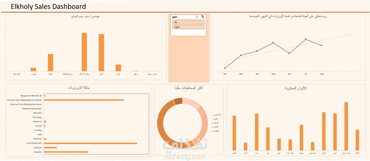 تابعة لشركة تخزين وتسويق، والثانية لشركة شحن. كانت البيانات غير منظمة، فوضوية، ومكتوبة بالكامل باللغة العربية، مما أضاف طبقة إضافية من التعقيد إلى عملية التحليل. نفذت كامل مراحل العمل باستخدام Excel، بدءًا من استكشاف البيانات وتنظيفها لضمان الاتساق والدقة، وصولًا إلى عمل الداشبورد النهائية. النتيجة النهائية كانت لوحة معلومات ديناميكية وتفاعلية (داشبورد) تتيح للمستخدمين التنقل بين المؤشرات الرئيسية والاتجاهات بكل وضوح. تضمنت الداشبورد عناصر تحليلية متعددة، منها: رسم خطي عدد الاوردرات الشهرية تحليل اسباب عدم استلام الاوردرات من العملاء تحليل حالة الاوردرات أكثر المحافظات طلبا تحليل للألوان المطلوبة كل هذه العناصر تم تصميمها داخل Excel باستخدام أدوات متقدمة مثل PivotTables، Slicers، الرسوم البيانية الديناميكية، مما يوفّر تجربة تحليلية مرنة وسهلة للمستخدم النهائي، ويعكس قدرة عالية على التعامل مع البيانات العربية المعقدة وتحويلها إلى رؤى قابلة للتنفيذ.