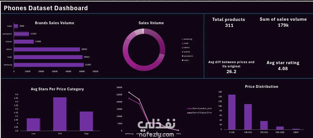 - بدأتُ العمل على ملف غير منظم، يحتوي على بيانات مبيعات الهواتف من عدة علامات تجارية. باستخدام Power Query، قمت بـ: تنظيف وتحويل أكثر من 20 عمودًا لضمان الدقة في البيانات. تحليل وتوحيد بيانات حجم المبيعات، بما في ذلك القيم التي تحتوي على لاحقة "K". إزالة التكرارات والحقول غير المهمة. استخراج أسماء العلامات التجارية من عناوين المنتجات. - التصنيف والتحليل باستخدام DAX بعد تنظيف البيانات، استخدمت DAX داخل Power Pivot لتنفيذ: تصنيف الهواتف إلى فئات سعرية: منخفضة، متوسطة، وعالية. إنشاء فترات سعرية مخصصة لتحليل منظم. حساب الفرق بين السعر الأصلي وسعر البيع الفعلي لتحليل أنماط الخصومات. - الجداول المحورية والرسوم البيانية (Pivot Tables and Visuals) أنشأت عدة جداول محورية لاستكشاف: حجم المبيعات حسب العلامة التجارية، مع مقارنة أداء Samsung، iPhone، Nokia، وغيرها. توزيع المنتجات حسب الفئة السعرية. متوسط التقييم لكل فئة سعرية. مؤشرات رئيسية مثل: إجمالي عدد المنتجات: 311 إجمالي حجم المبيعات: 179 ألف متوسط الفرق بين السعر الأصلي وسعر البيع: 26.2 متوسط التقييم: 4.08 - لوحة المعلومات النهائية (داشبورد) كل هذه التحليلات تم دمجها داخل لوحة معلومات تفاعلية واحدة باستخدام Excel، مصممة بأسلوب بسيط وواضح يسهّل اتخاذ القرار. تتضمن الداشبورد: مخطط شريطي لحجم مبيعات العلامات التجارية: يوضح تفوق Samsung وiPhone. مخطط دائري لتوزيع المبيعات: يعرض النسب لكل علامة تجارية. رسم بياني لعدد المنتجات حسب الفئة السعرية. تحليل الفرق ما بين السعر الأساسي وسعر البيع حسب العلامة التجارية.