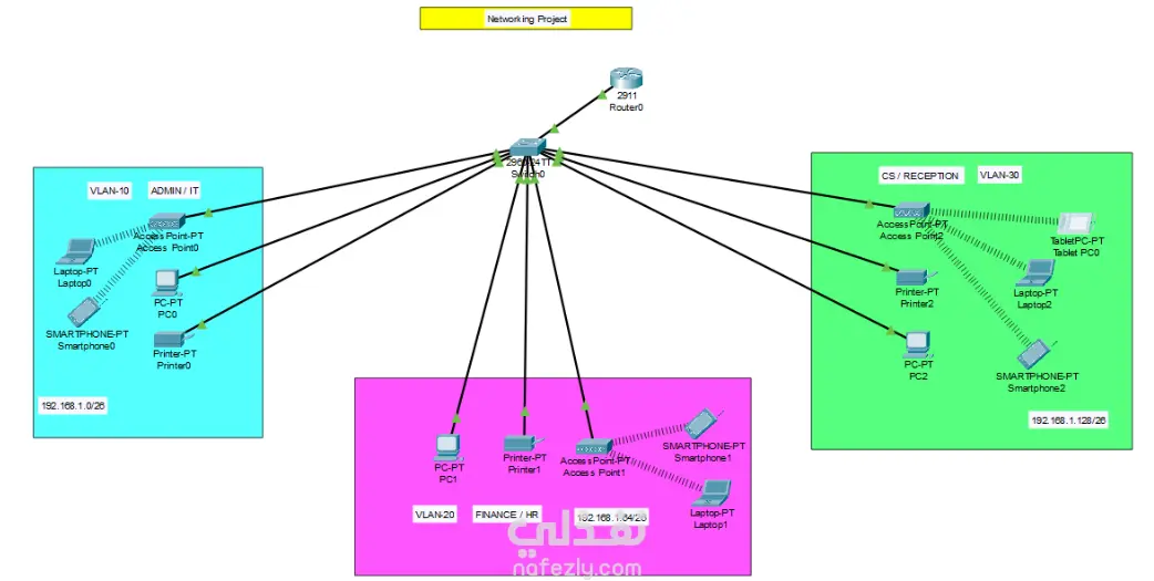 • Automatic IP addressing using DHCP • Inter-VLAN routing configured on router • Wireless network per department • Devices successfully tested for connectivity across VLANs
