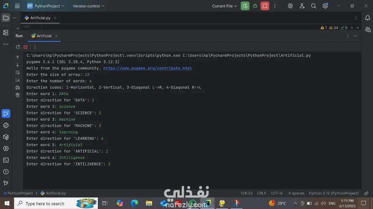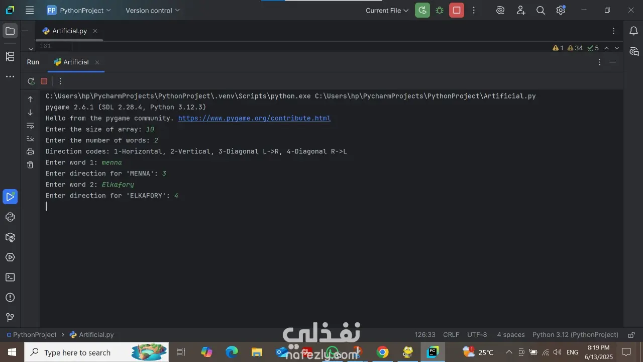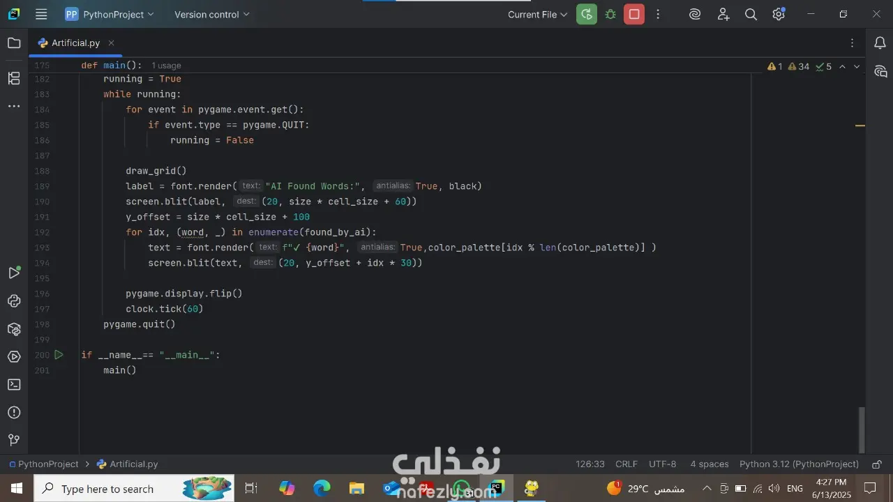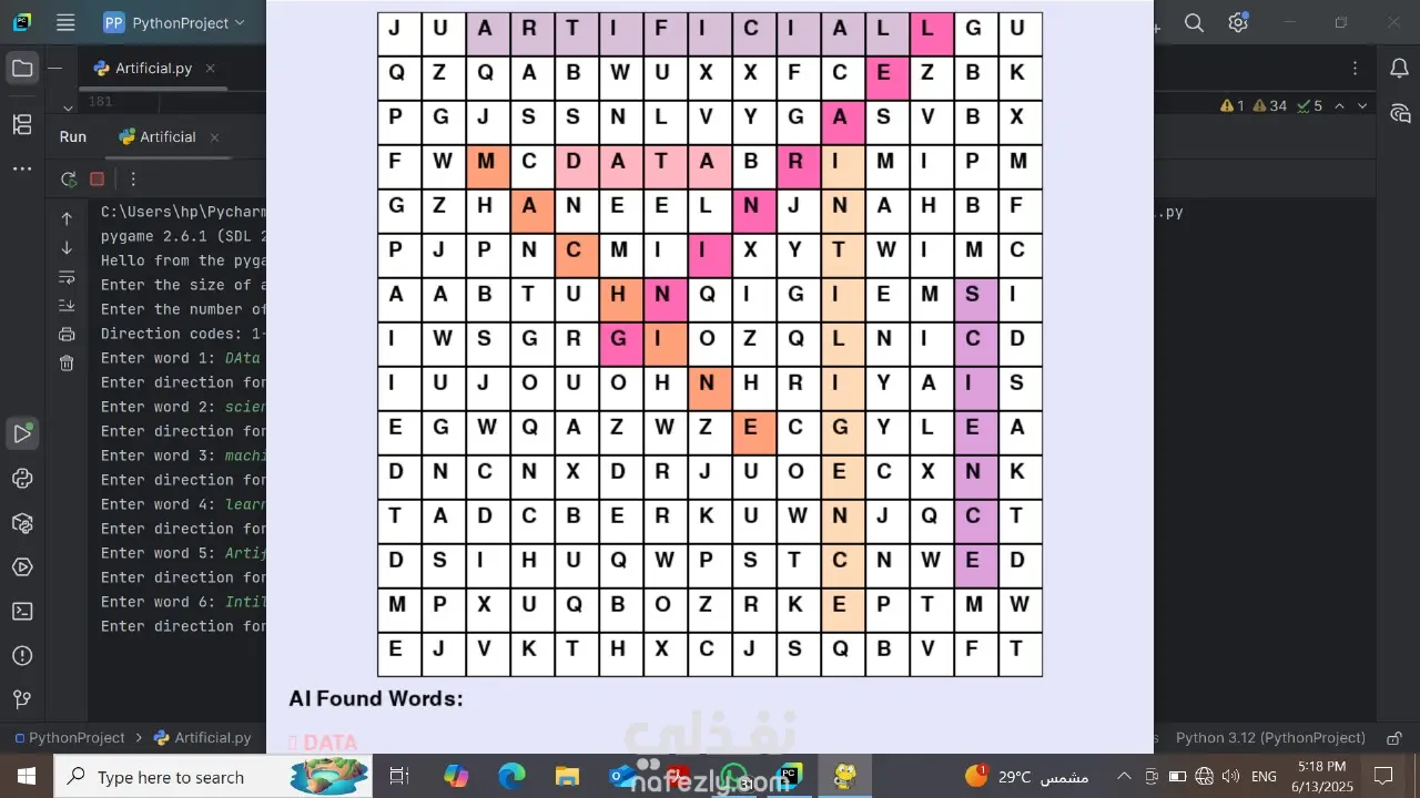 طورت لعبة تفاعلية لبحث الكلمات (Word Search) باستخدام Python و Pygame.