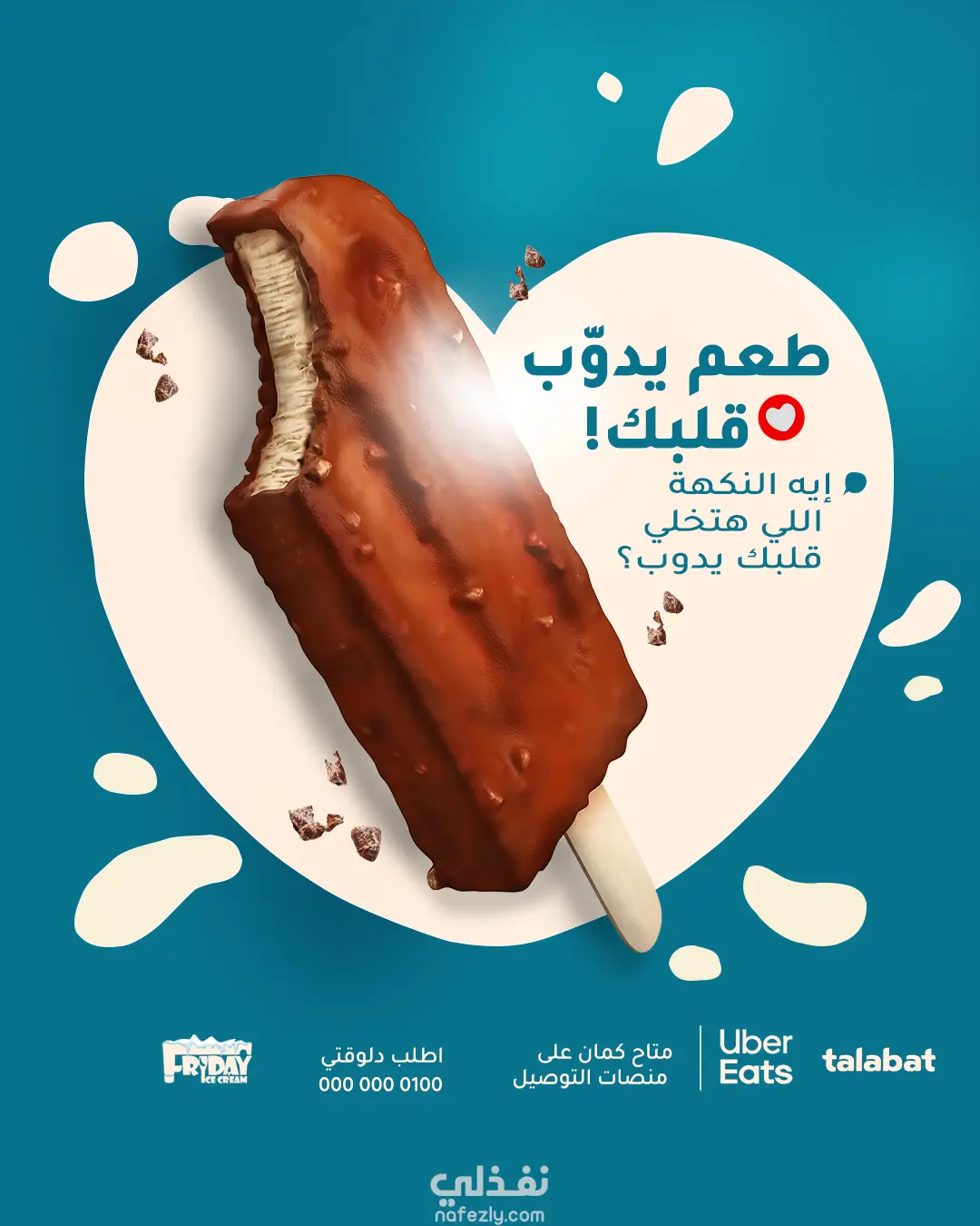 التصميم دا جزء من حملة تعريفية بمنتج آيس كريم “Friday” بعد توفره في المحلات، وكان الهدف الإعلان عن توفره كمان على تطبيقات توصيل الأكل. استخدمت أسلوب بصري بسيط بيركز على المنتج نفسه مع خلفية هادئة تبرز شكل الآيس كريم وتخلي المشاهد يحس بإحساس الطعم والانتعاش. ركزت على التوازن بين الجاذبية والبساطة عشان يوصل الإعلان رسالته بسرعة على السوشيال ميديا.