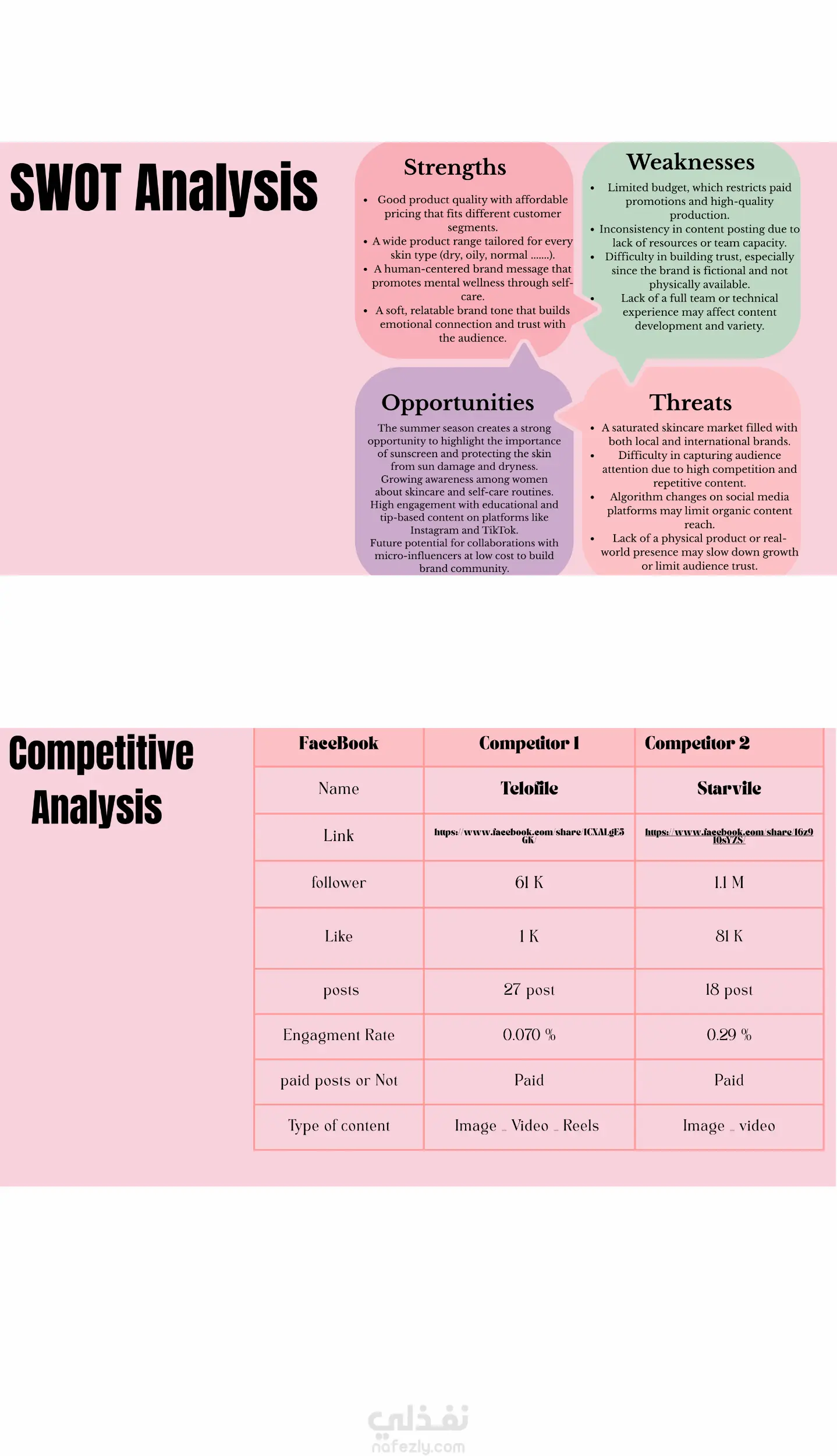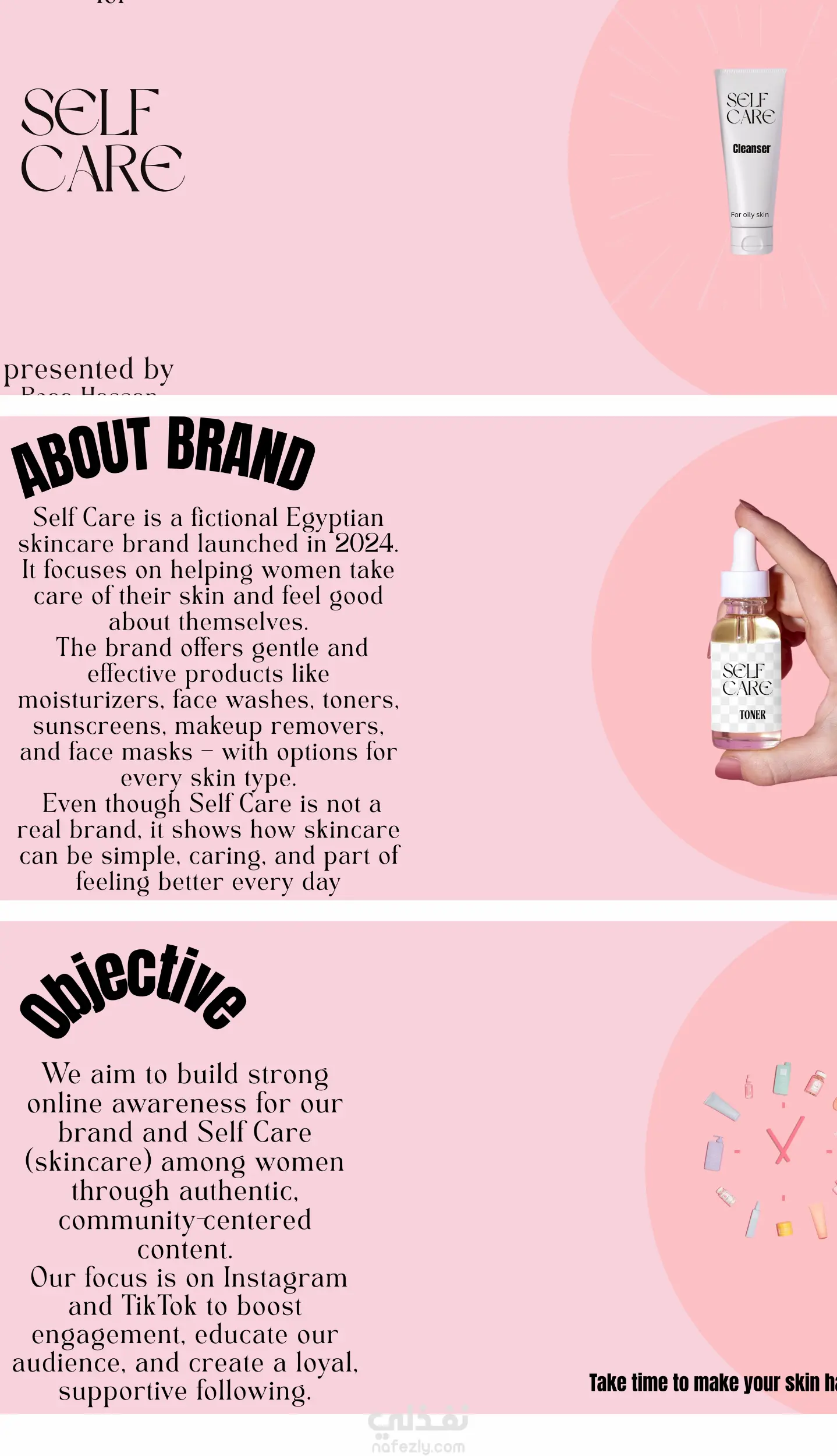 البراند هو سيلف كير المتخصص في مستحضرات العناية بالبشره ويستهدف السيدات الهدف الأساسي للمشروع كان زيادة الوعي بالبراند وجذب عملاء جدد مع تحسين نسب التحويل وبناء هوية قوية في السوق. من خلال تحليل SWOT ظهر أن البراند يتميز بجودة المنتجات والهوية البصرية، لكن يواجه تحديات مثل ضعف الانتشار ومحدودية الميزانية، بينما توجد فرص قوية للتوسع عبر السوشيال ميديا والشراكات، مع تهديدات من المنافسة القوية وتغير سلوك المستهلك. تحليل المنافسين أوضح أن السوق يضم براندات منتشرة بأسعار مختلفة وجودة متنوعة، مما يمنح البراند فرصة للتميز.
