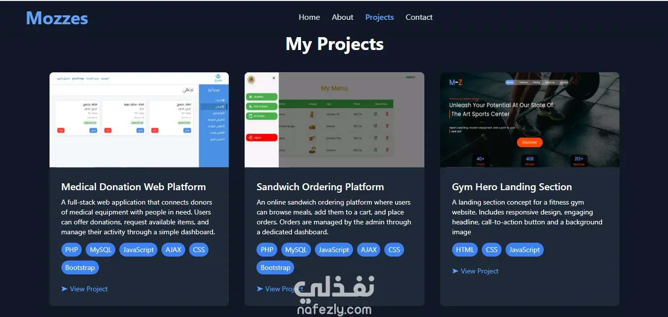 انشاء موقع بورتفوليو لعرض الأعمال البرمجية باستخدام React و TailwindCSS للحصول على واجهة تفاعلية. بالاضافة الى العمل بمكتبات أخرى مثل vanta.js و Three.js للحصول على animation ثلاثي الأبعاد في الخلفية. موقع البورتفوليو يحتوي على الاقسام التالية : Hero About Projects Contact (فورم contact تم ربطه ب emailjs لارسال ايمايلات دون الحاجة الى سيرفر)